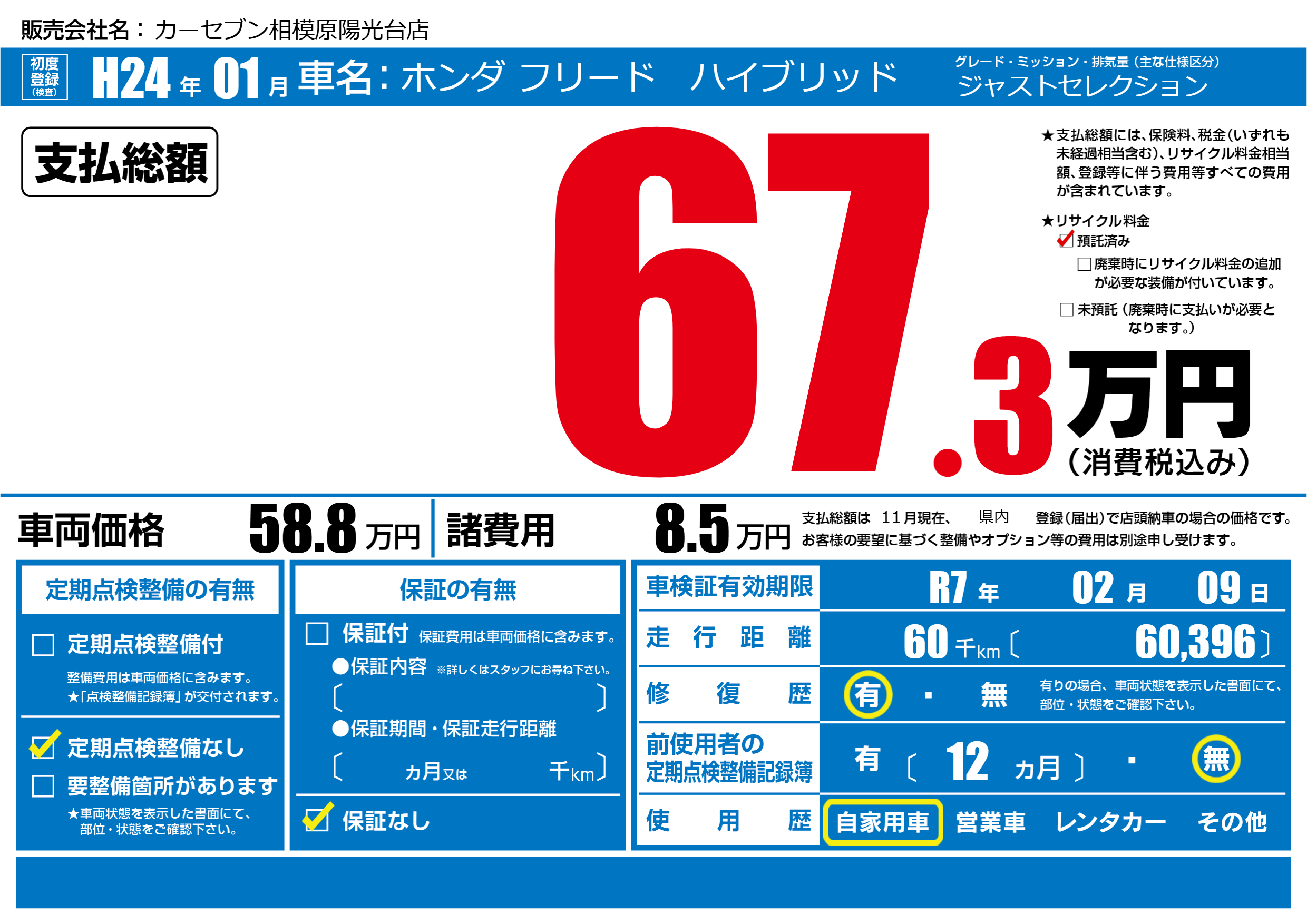 | 車名 | ホンダ フリード ハイブリッド | グレード ミッション 排気量 |