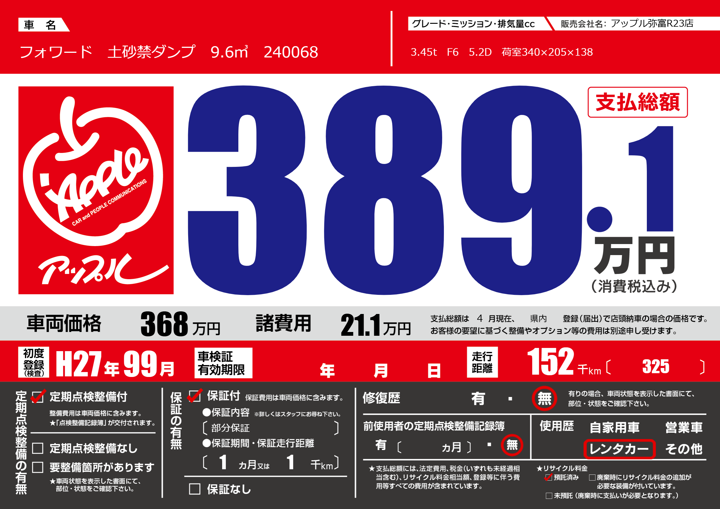 | 車名 | フォワード 土砂禁ダンプ 9.6㎥ 240068 | グレード ミッション 排気量 |