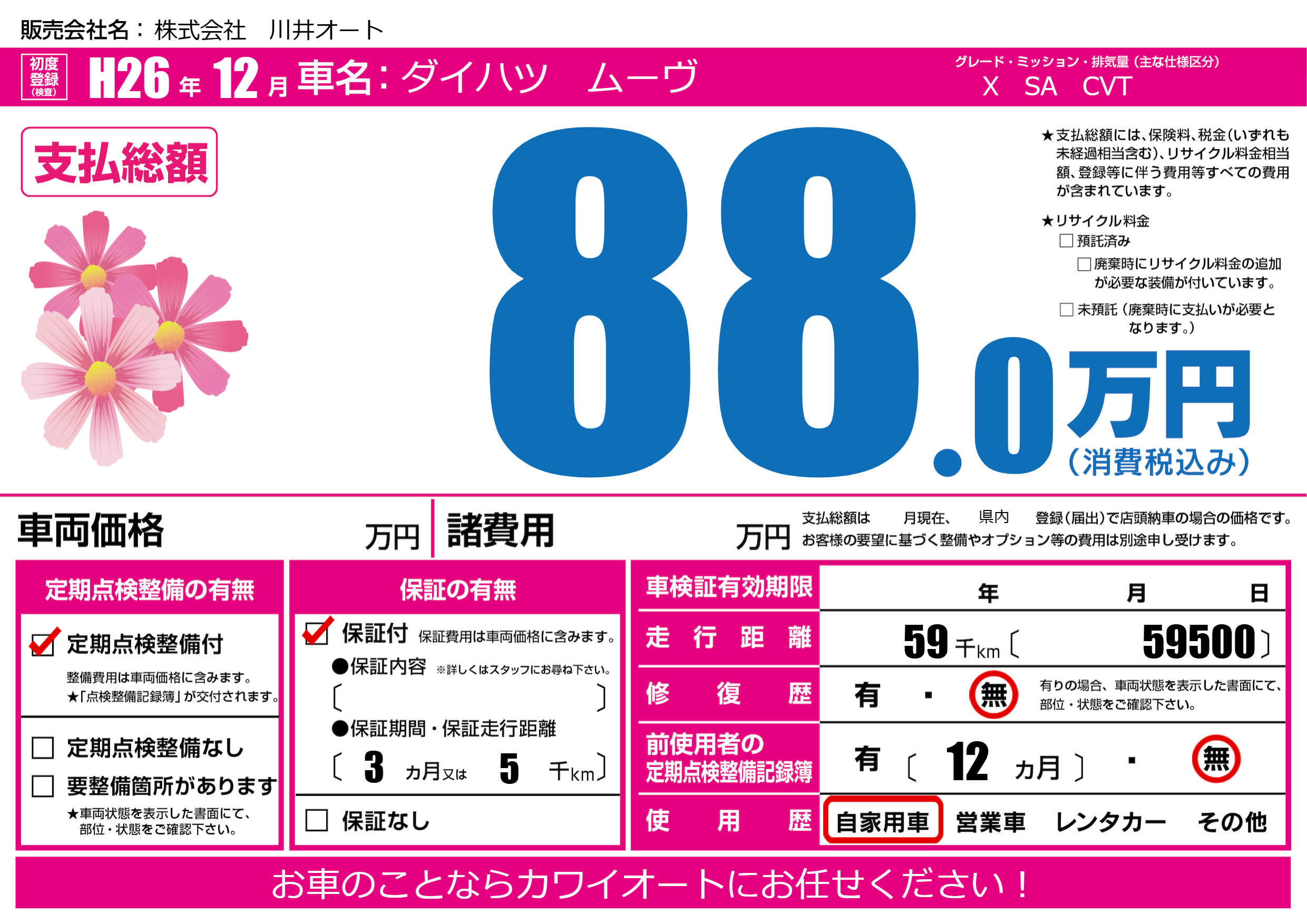 | 車名 | ダイハツ ムーヴ | グレード ミッション 排気量 |