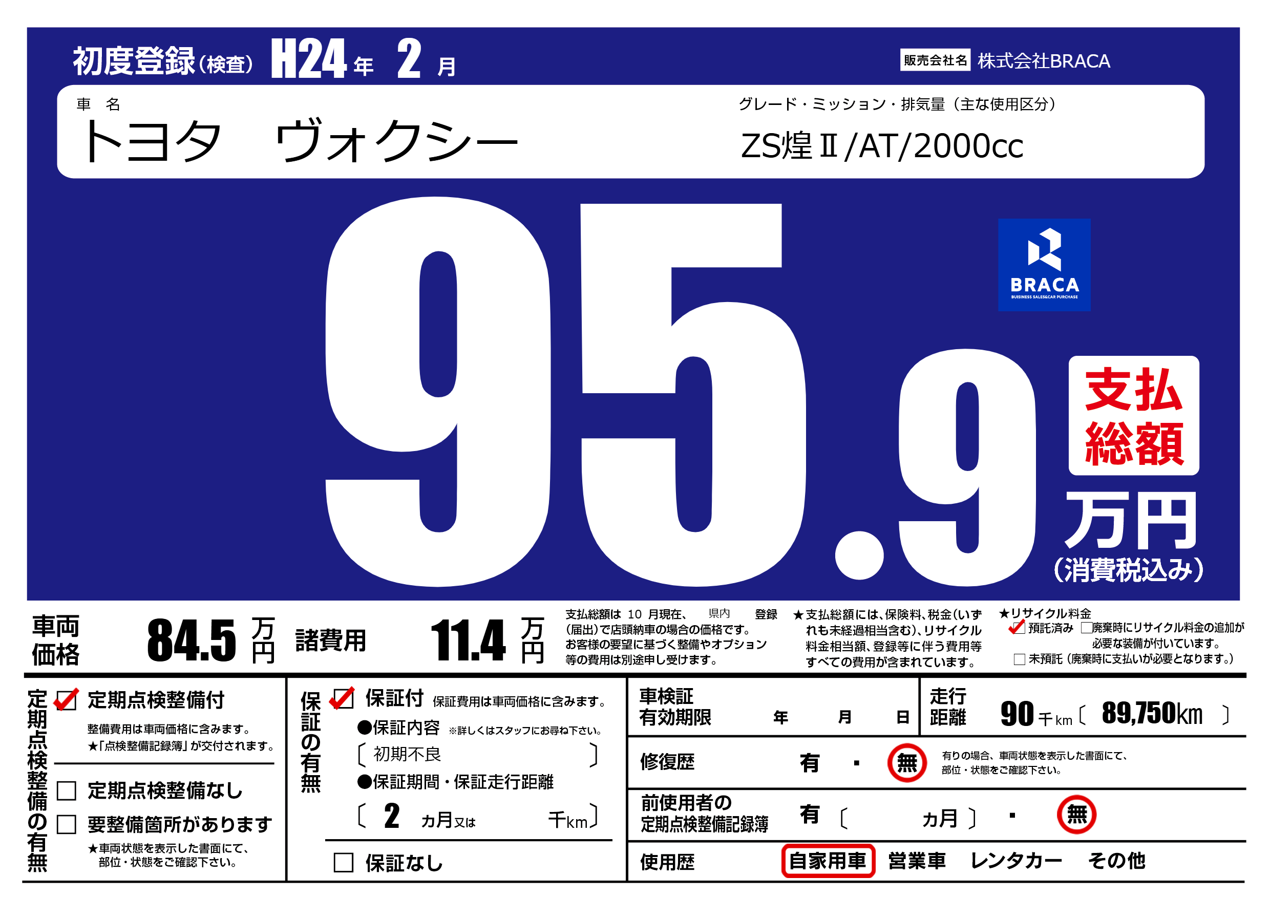 | 走行キロ | 9万km | 初年度登録 | H24年2月 |