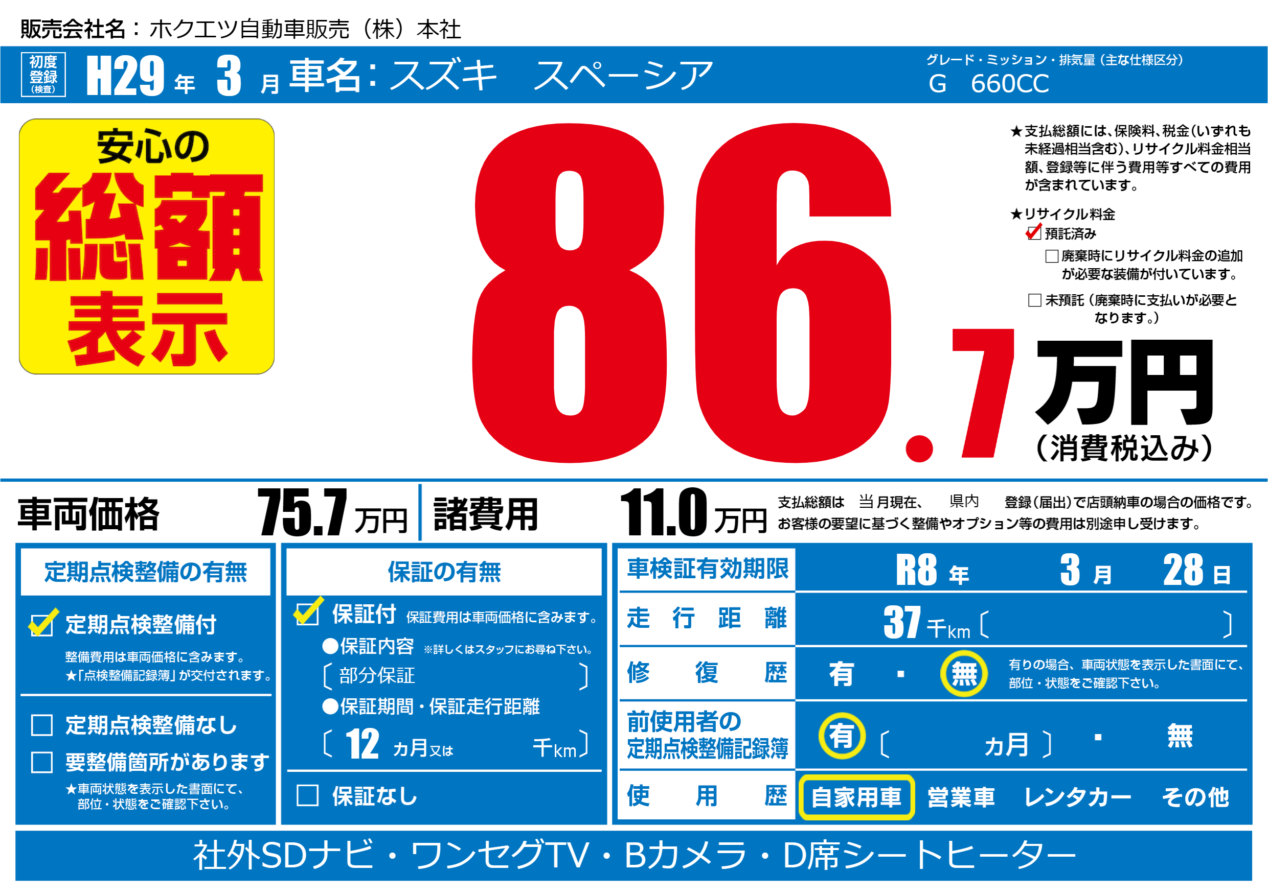 | 走行キロ | 3.7万km | 初年度登録 | H29年3月 |