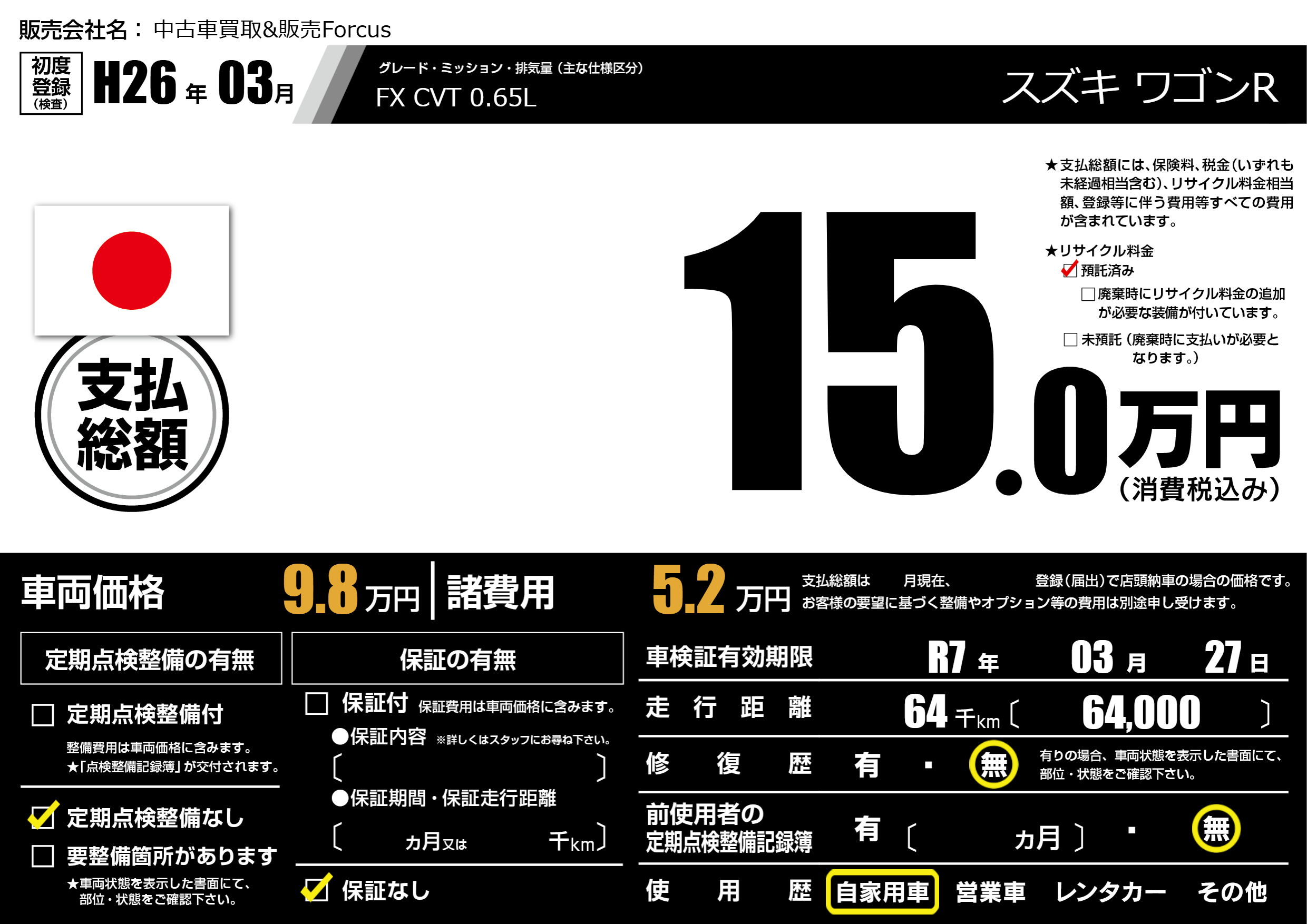 | 車名 | スズキ ワゴンR | グレード ミッション 排気量 |