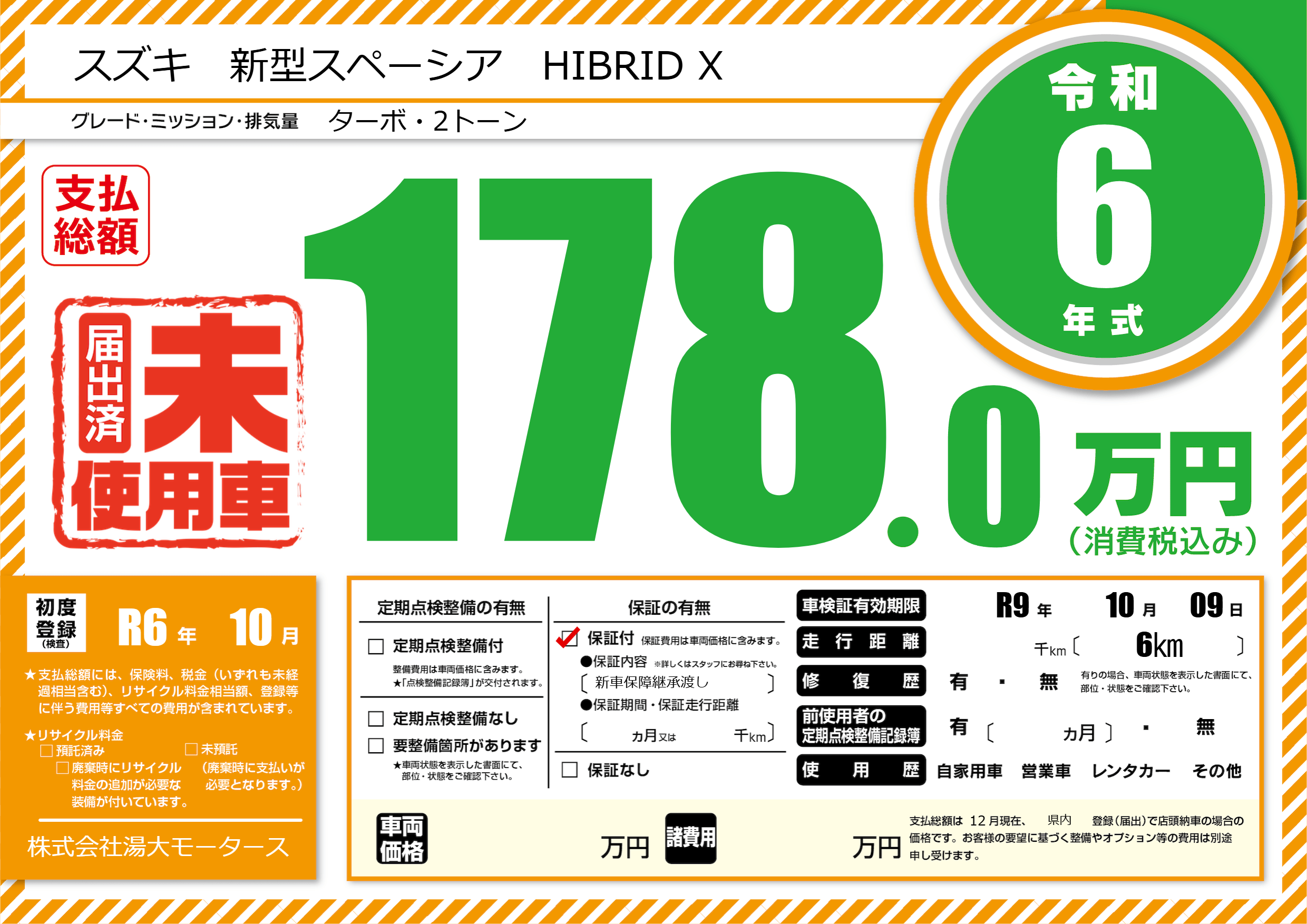| 車名 | スズキ 新型スペーシア HIBRID X | グレード ミッション 排気量 |