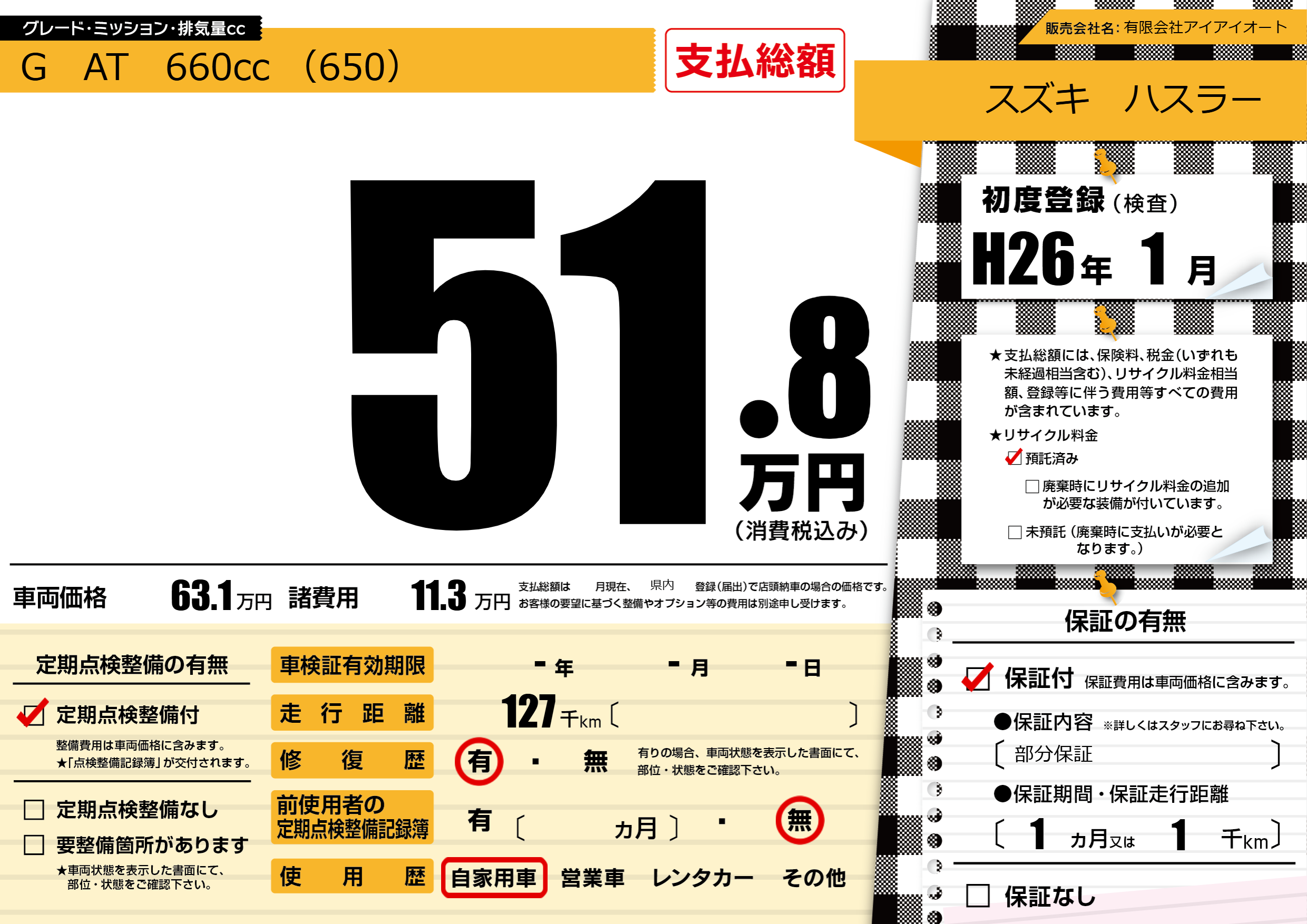 保証付き 保証内容(部分保証) 1ヶ月または(1)千kmまで |