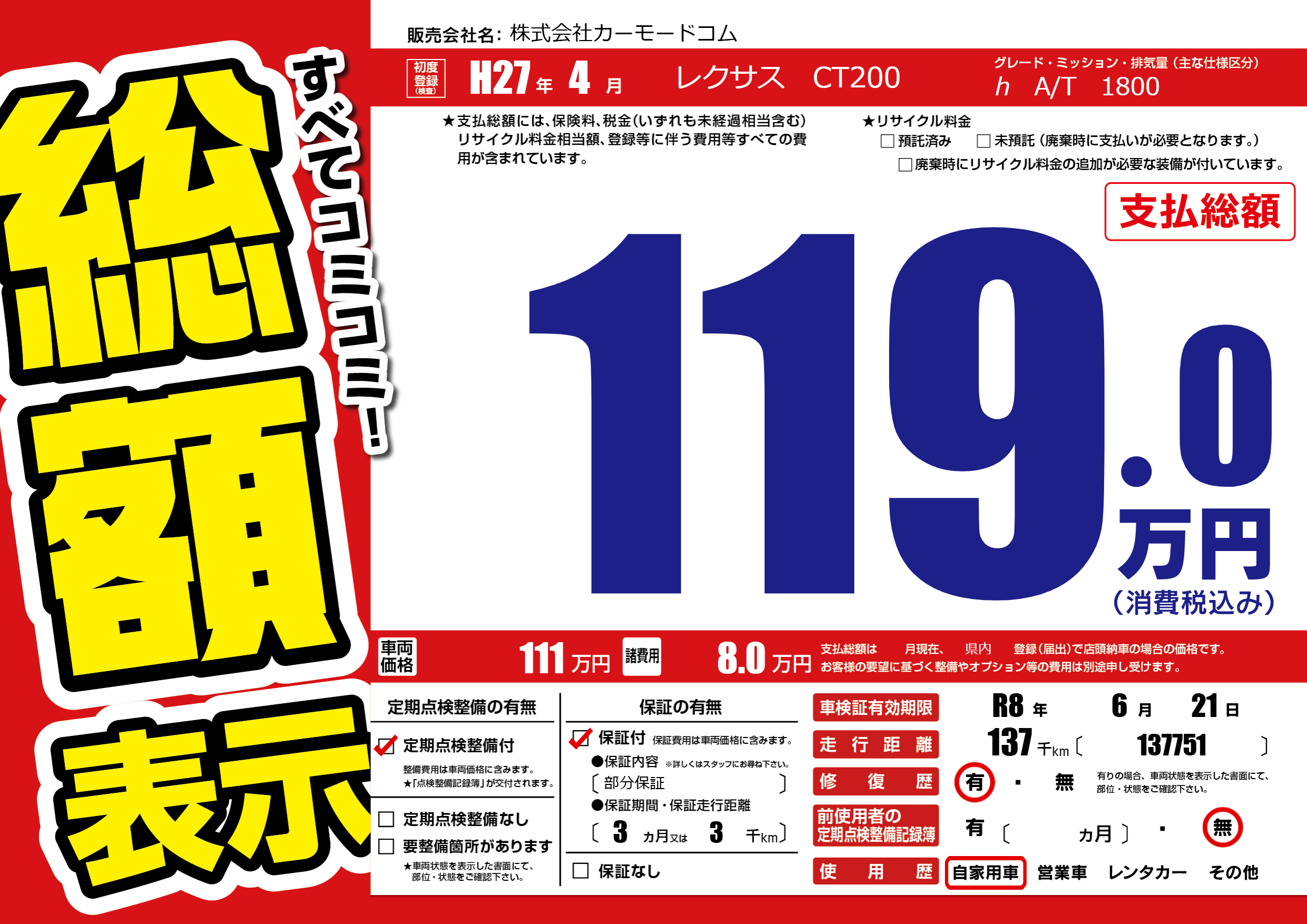 | 車名 | レクサス CT200 | グレード ミッション 排気量 |