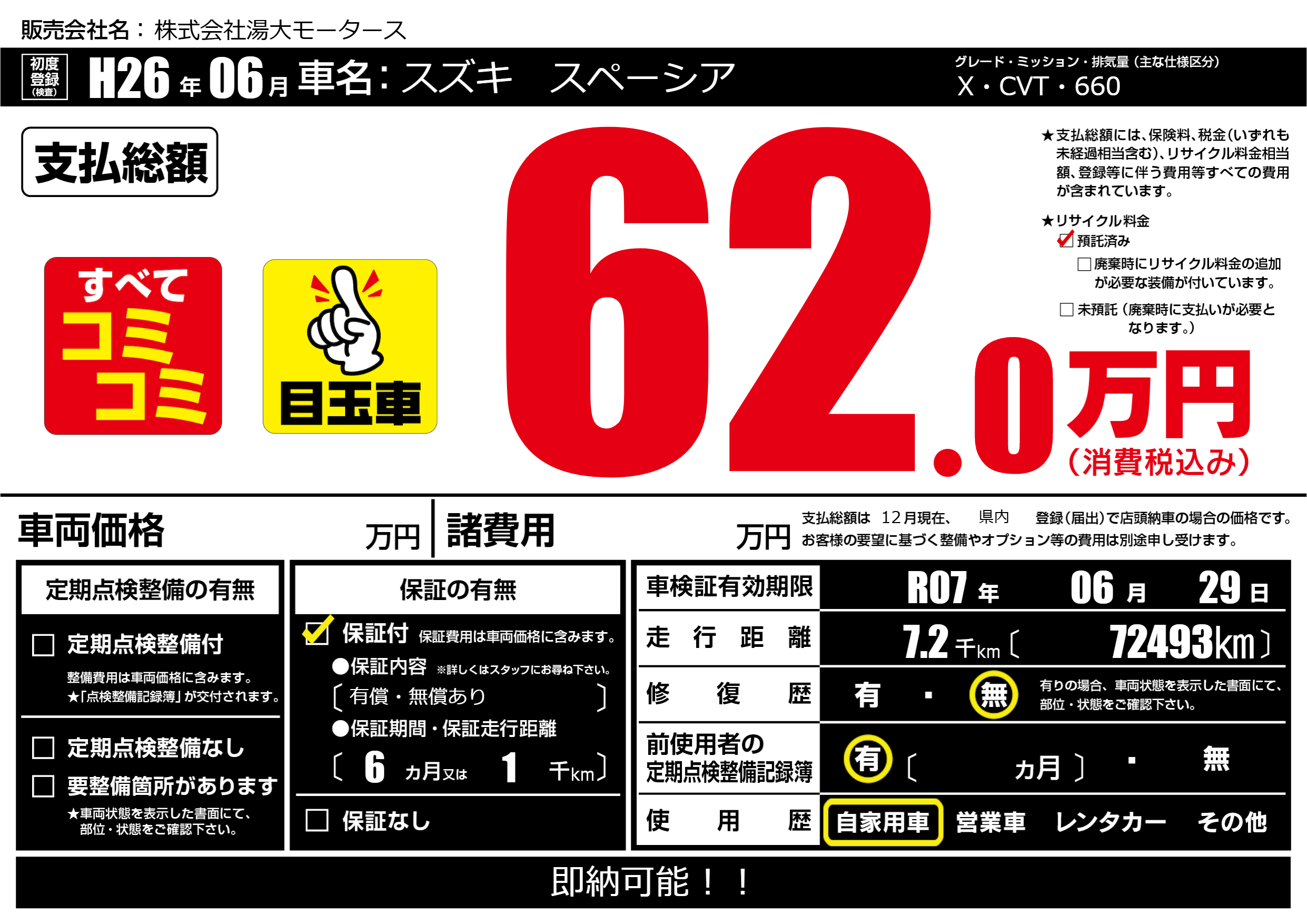 | 車名 | スズキ スペーシア | グレード ミッション 排気量 |
