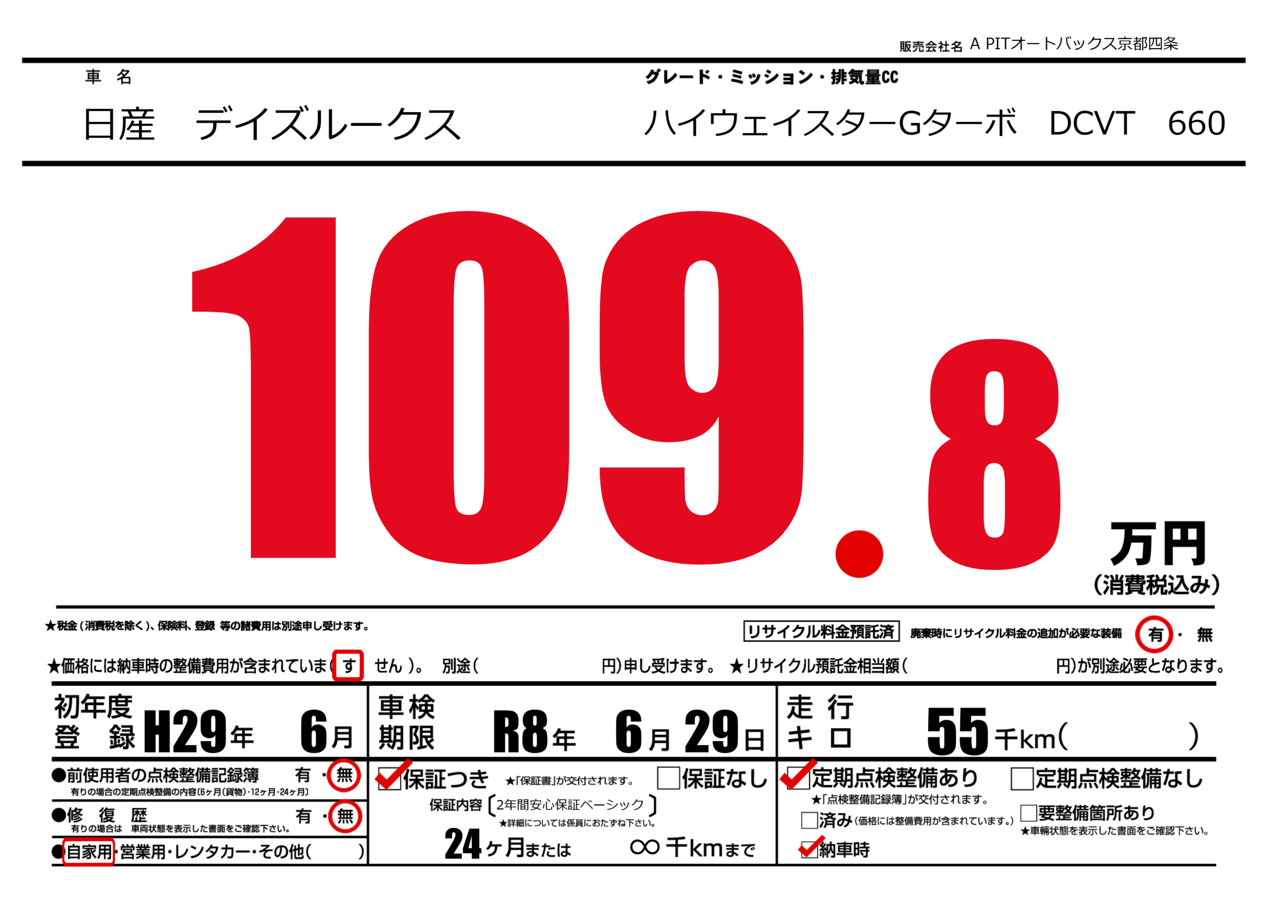 | 車名 | 日産 デイズルークス | グレード ミッション 排気量 |