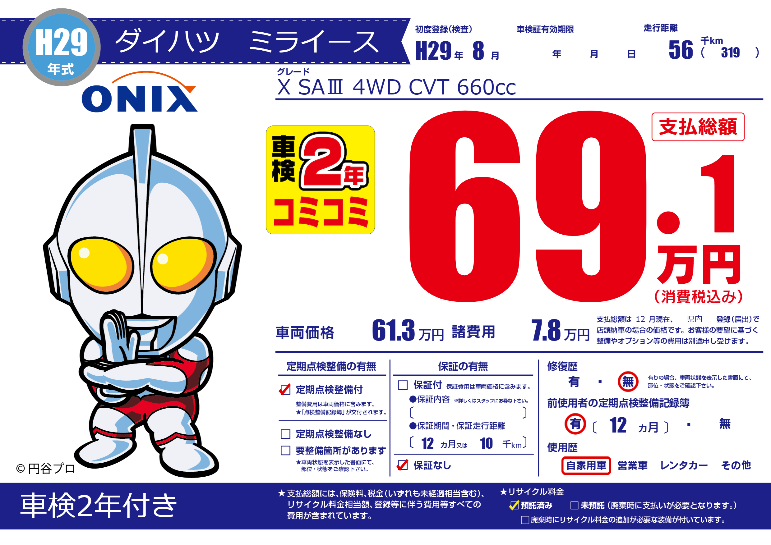 | 車名 | ダイハツ ミライース | グレード ミッション 排気量 |