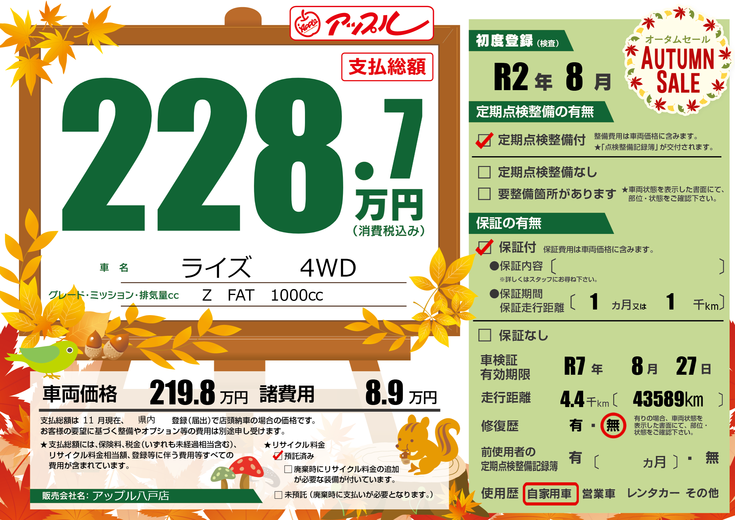 | 走行キロ | 0.4万km | 初年度登録 | R2年8月 |