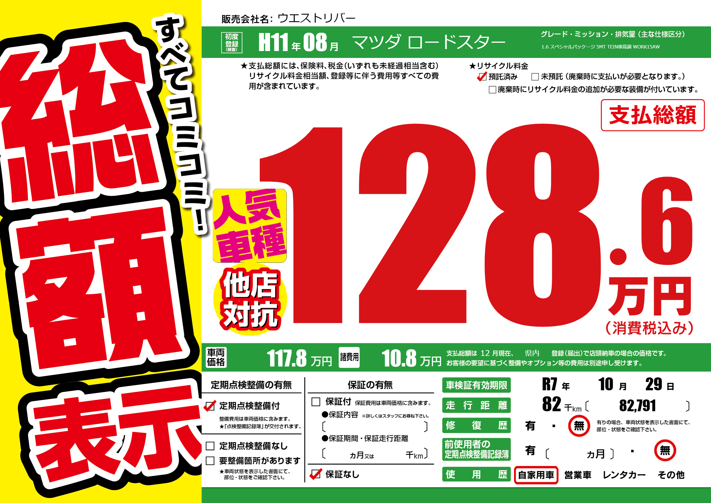 | 走行キロ | 8.2万km | 初年度登録 | H11年08月 |