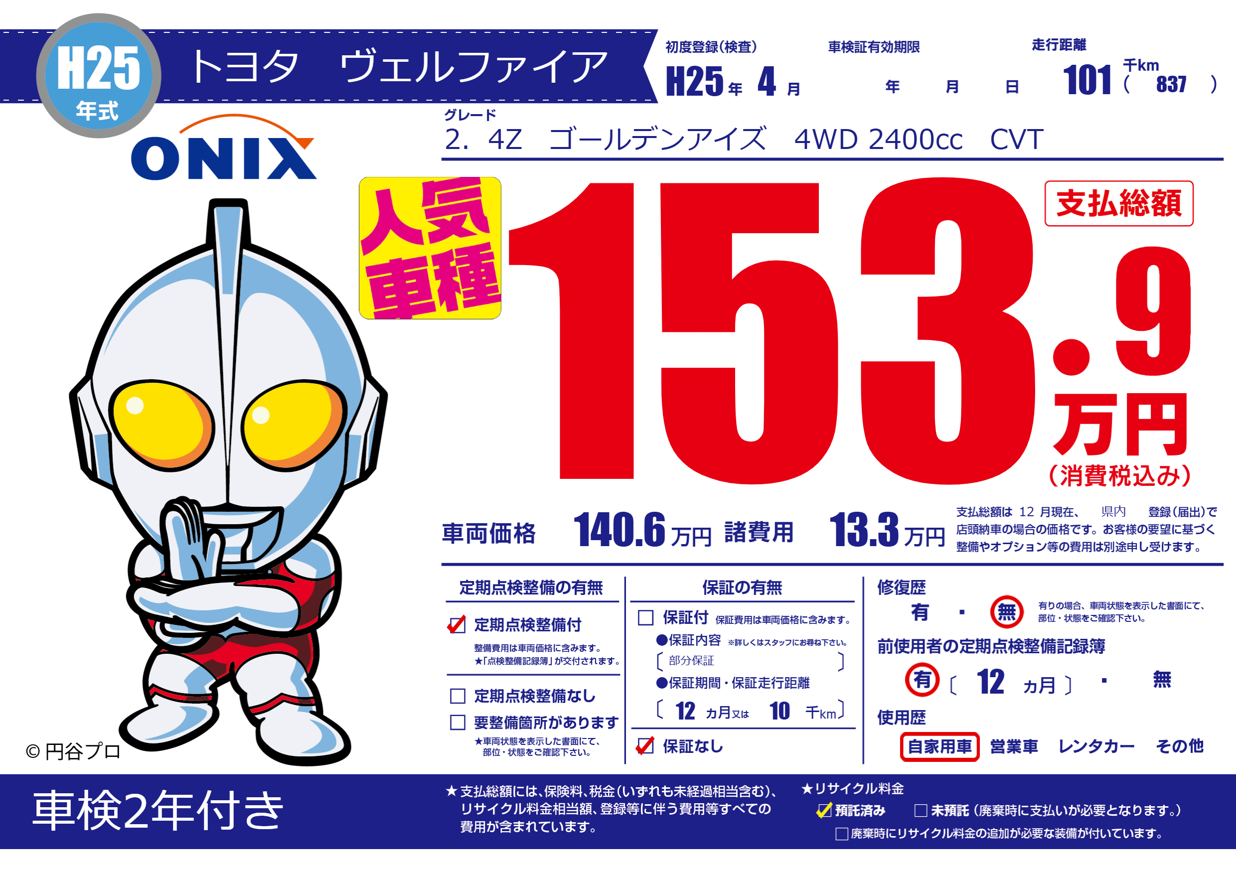 | 車名 | トヨタ ヴェルファイア | グレード ミッション 排気量 |