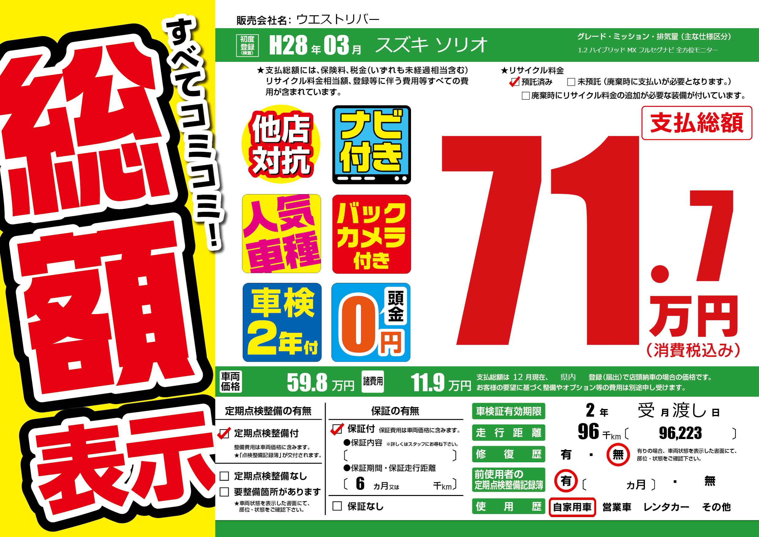 | 走行キロ | 9.6万km | 初年度登録 | H28年03月 |