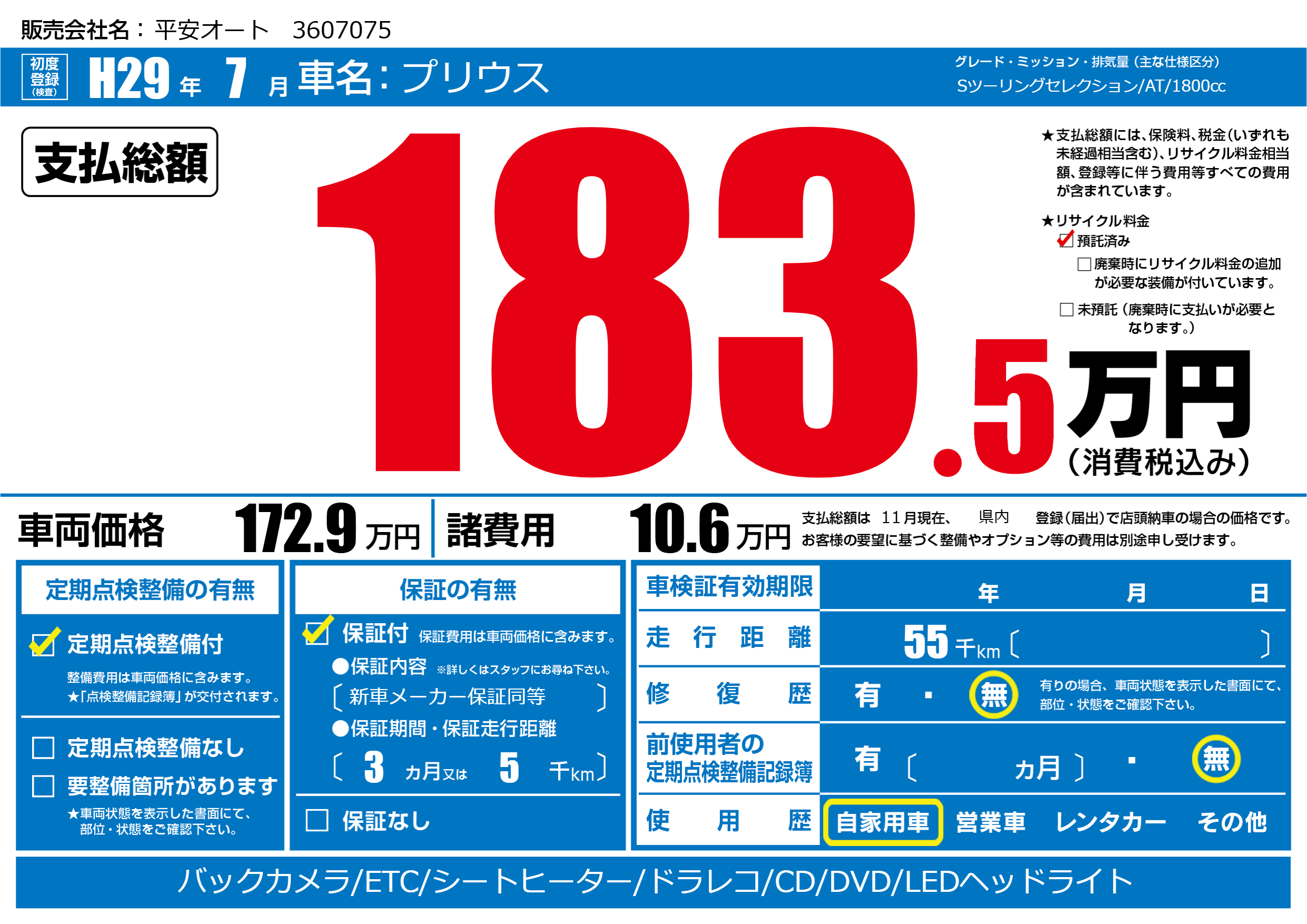 | 車名 | プリウス | グレード ミッション 排気量 |