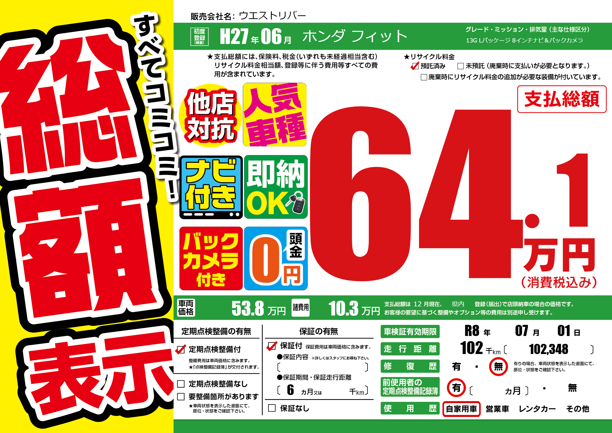 | 走行キロ | 10.2万km | 初年度登録 | H27年06月 |