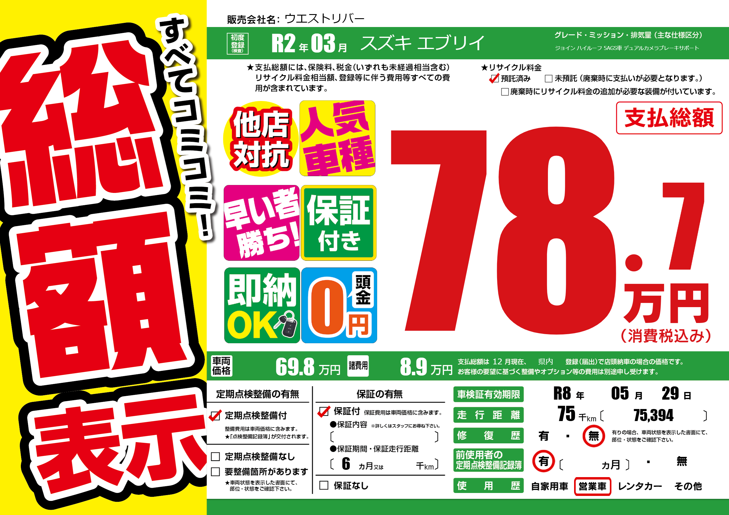 | 車名 | スズキ エブリイ | グレード ミッション 排気量 |