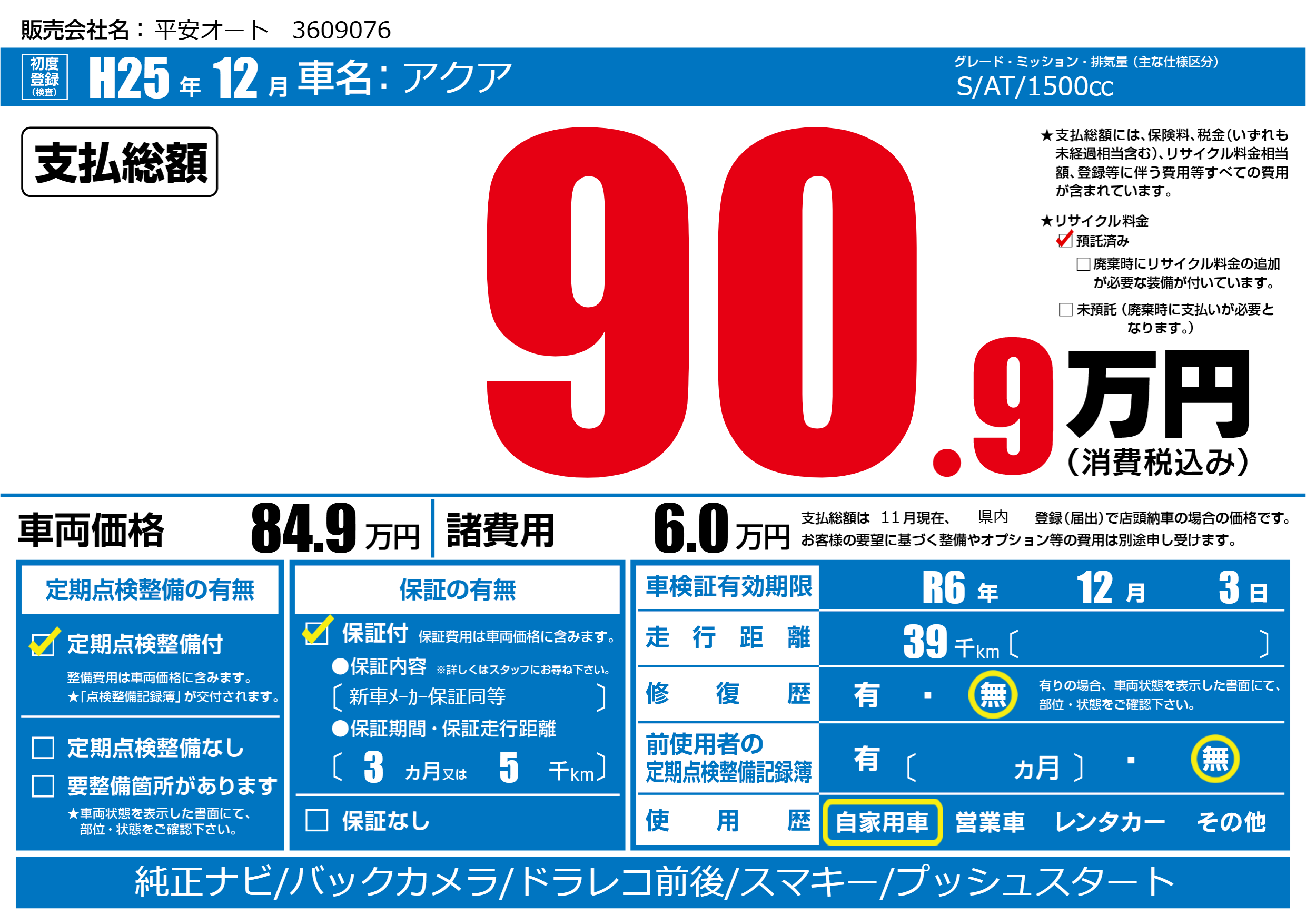 なし | 車検制限 | R6年12月3月 |