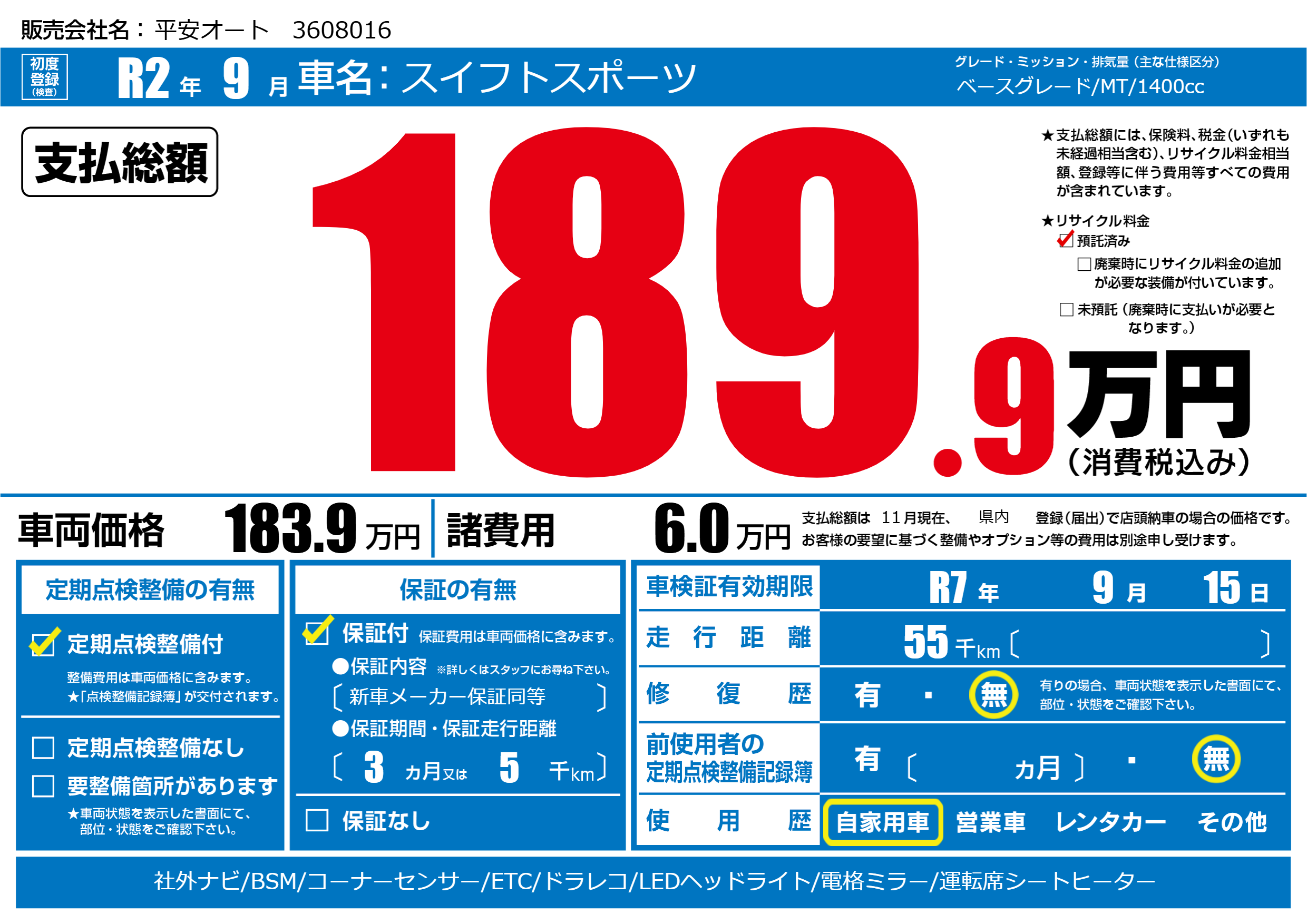| 車検制限 | R7年 9月 15日 | ||