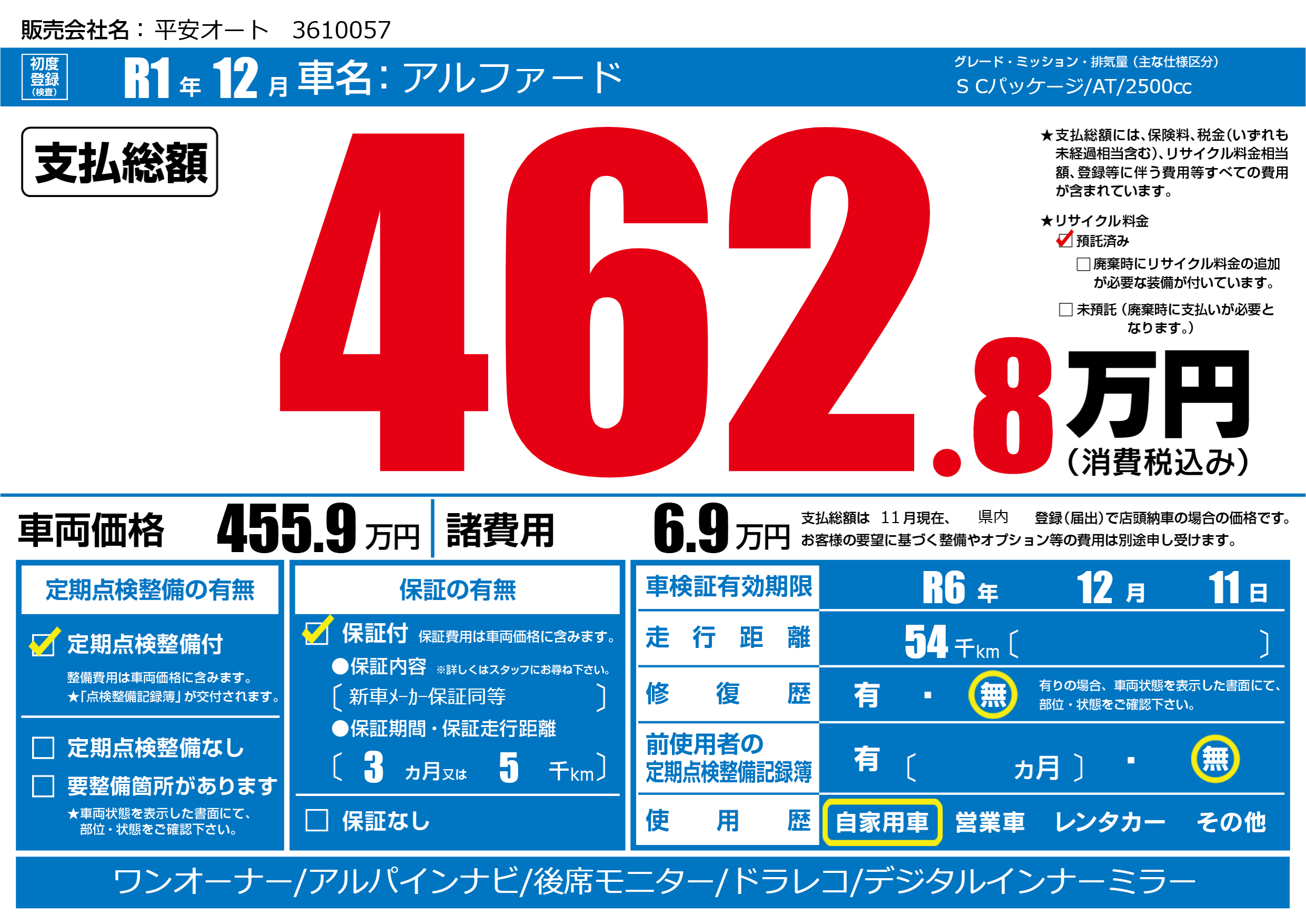 | 車名 | アルファード | グレード ミッション 排気量 |