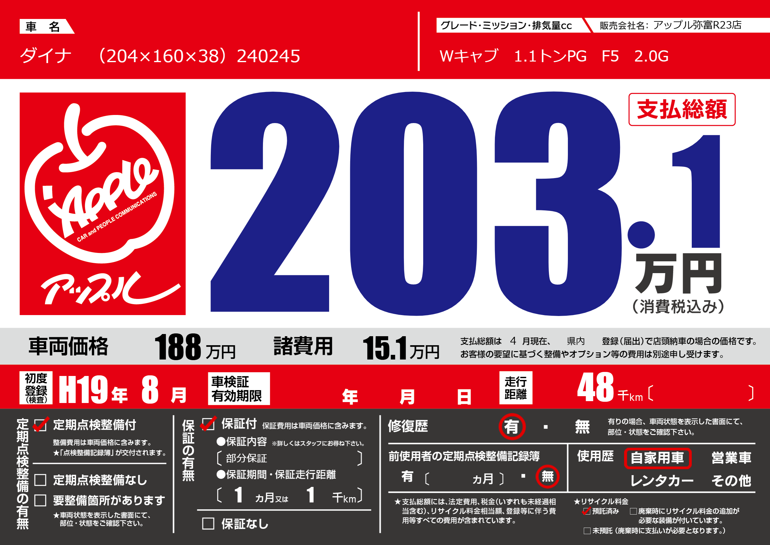 | 走行キロ | 4.8万km | 初年度登録 | H19年8月 |