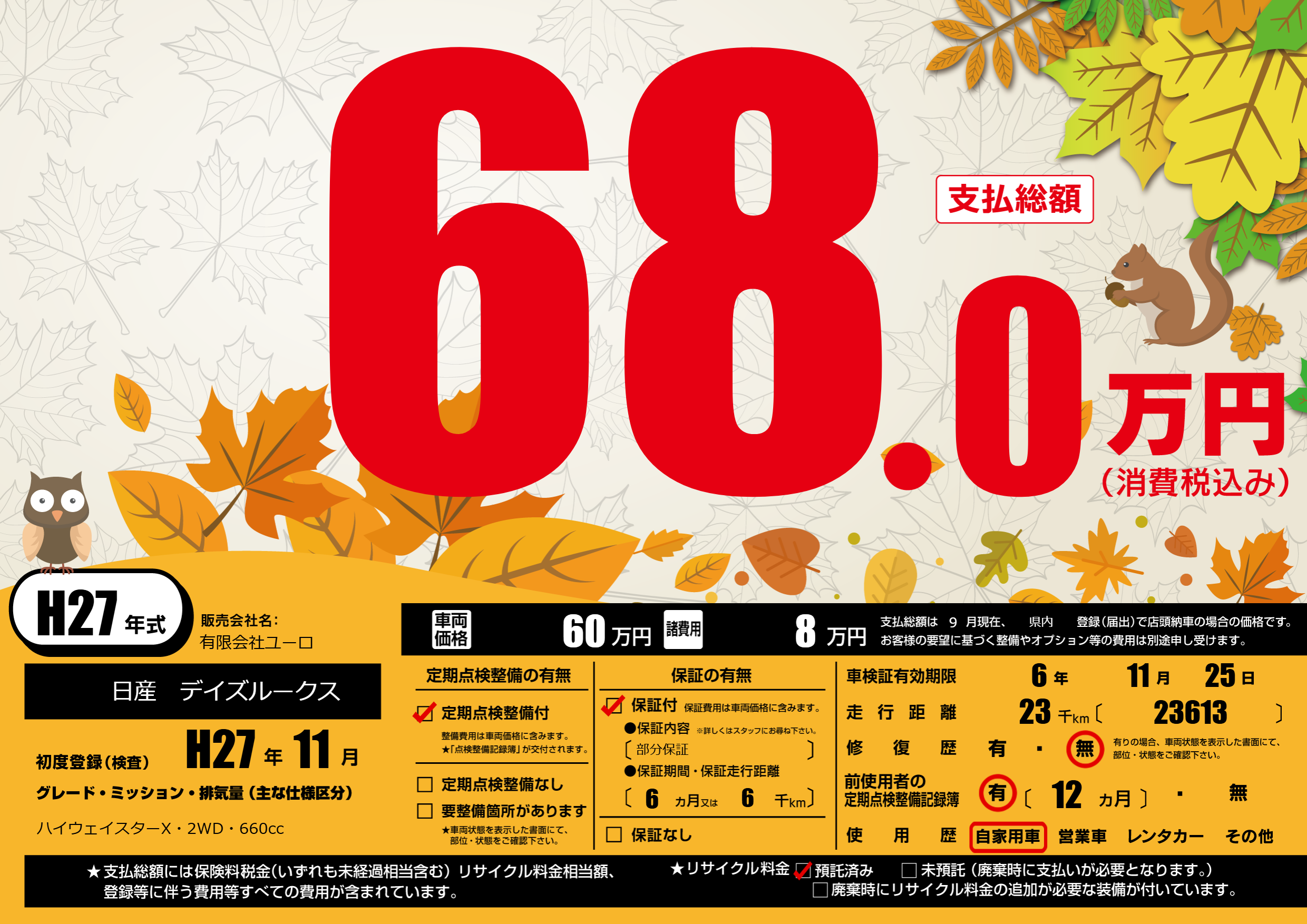 | 走行キロ | 2.3万km | 初年度登録 | H27年11月 |