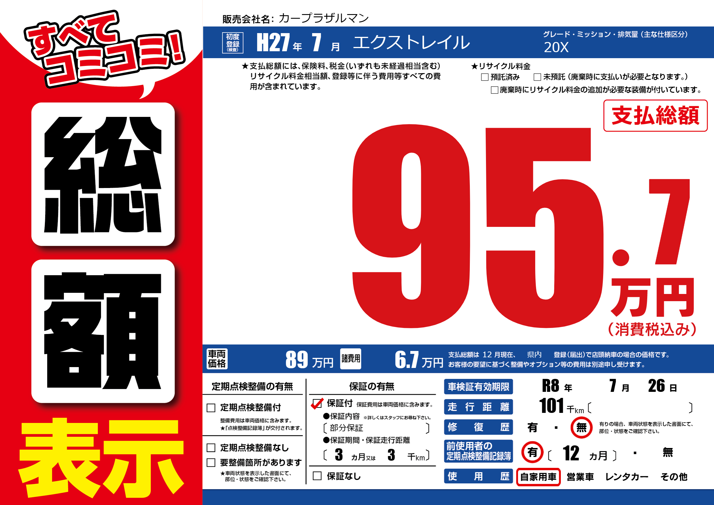 | 車名 | エクストレイル | グレード ミッション 排気量 |