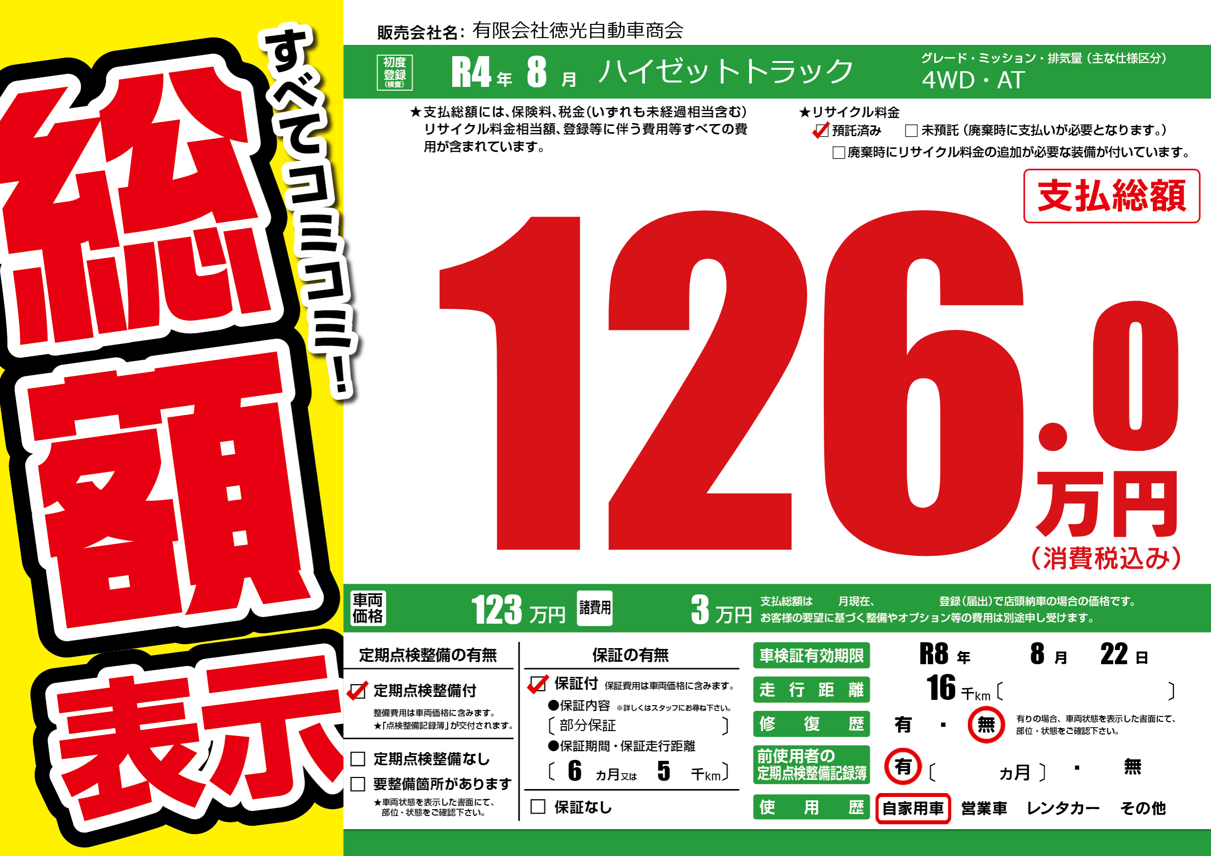 | 車名 | ハイゼットトラック | グレード ミッション 排気量 |