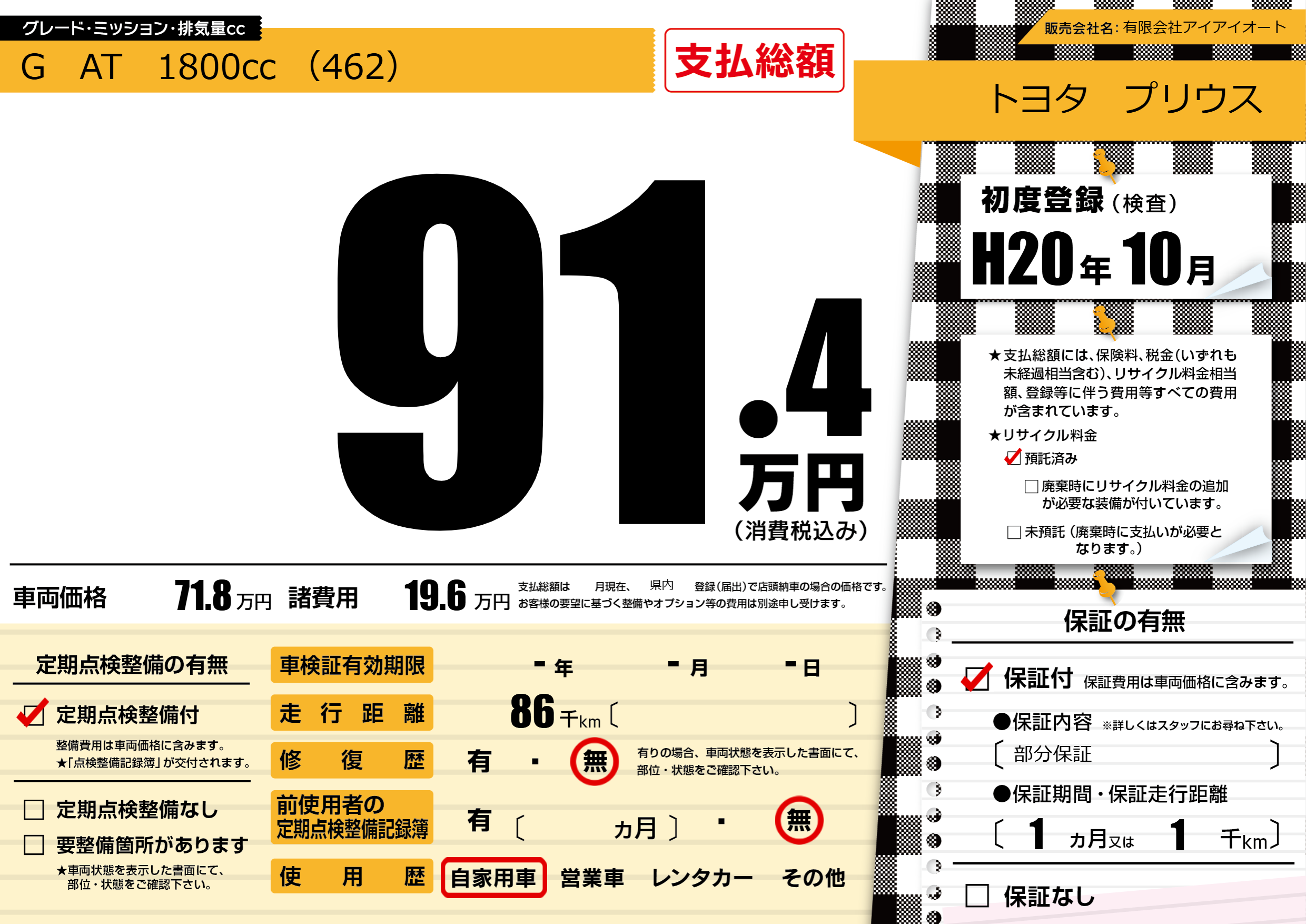 | 車名 | トヨタ プリウス | グレード ミッション 排気量 |