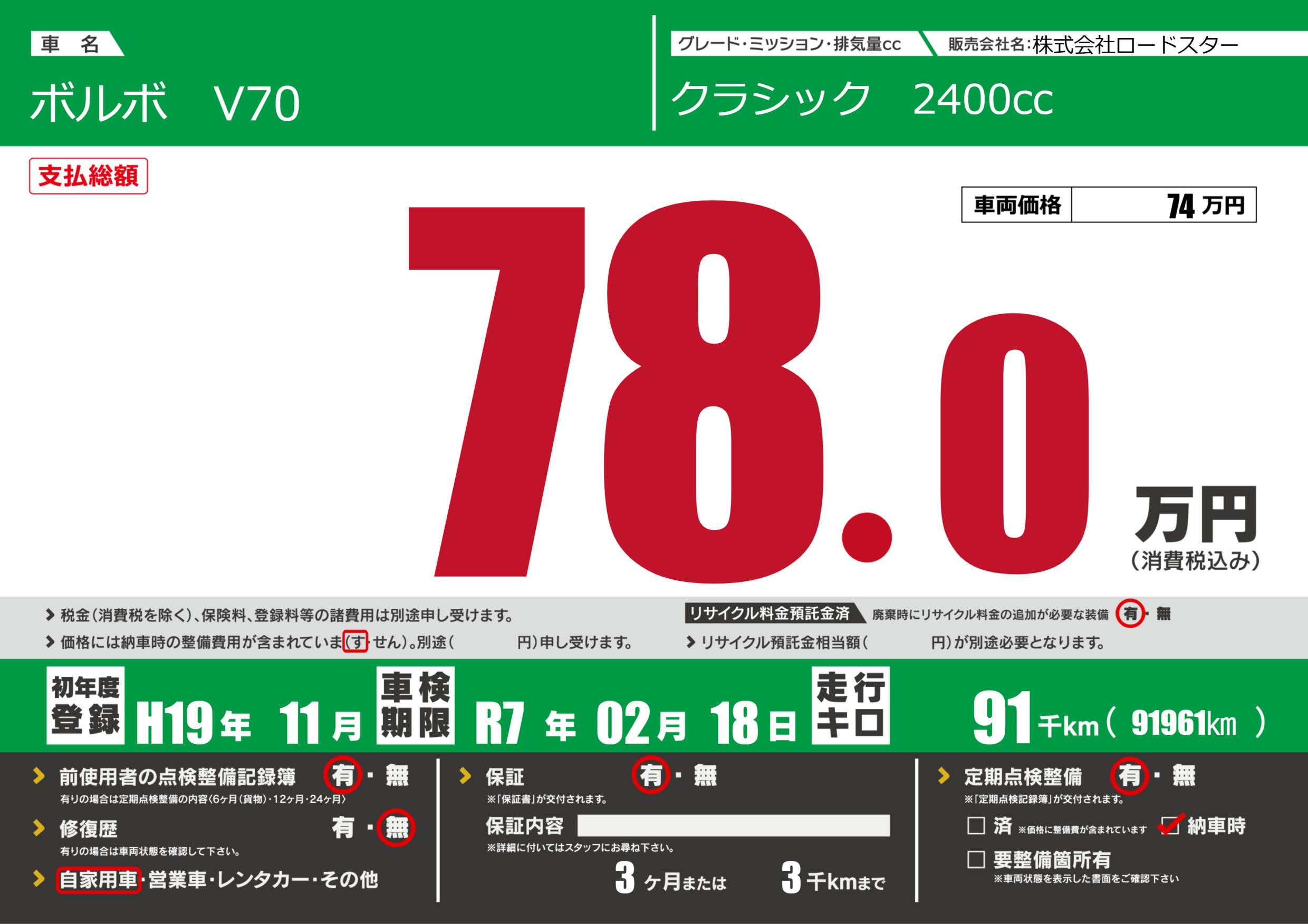 保証付き 保証内容(---) 3ヶ月または(3)千kmまで |