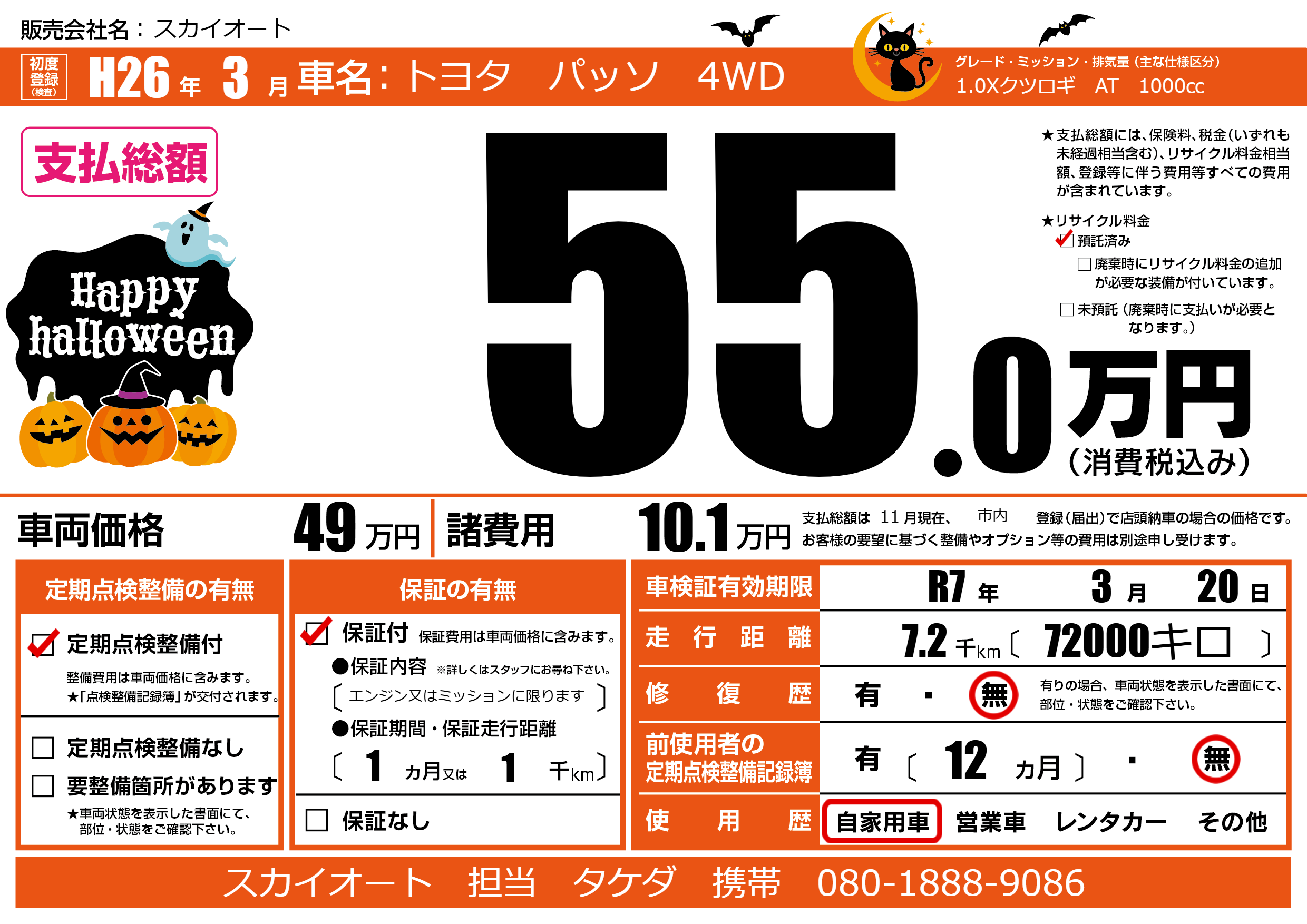 | 車名 | トヨタ パッソ 4WD | グレード ミッション 排気量 |