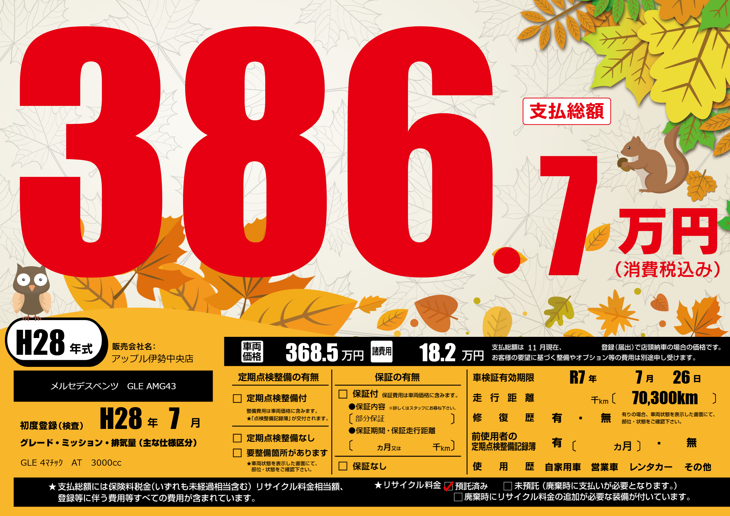 | 車名 | メルセデスベンツ GLE AMG43 | グレード ミッション 排気量 |