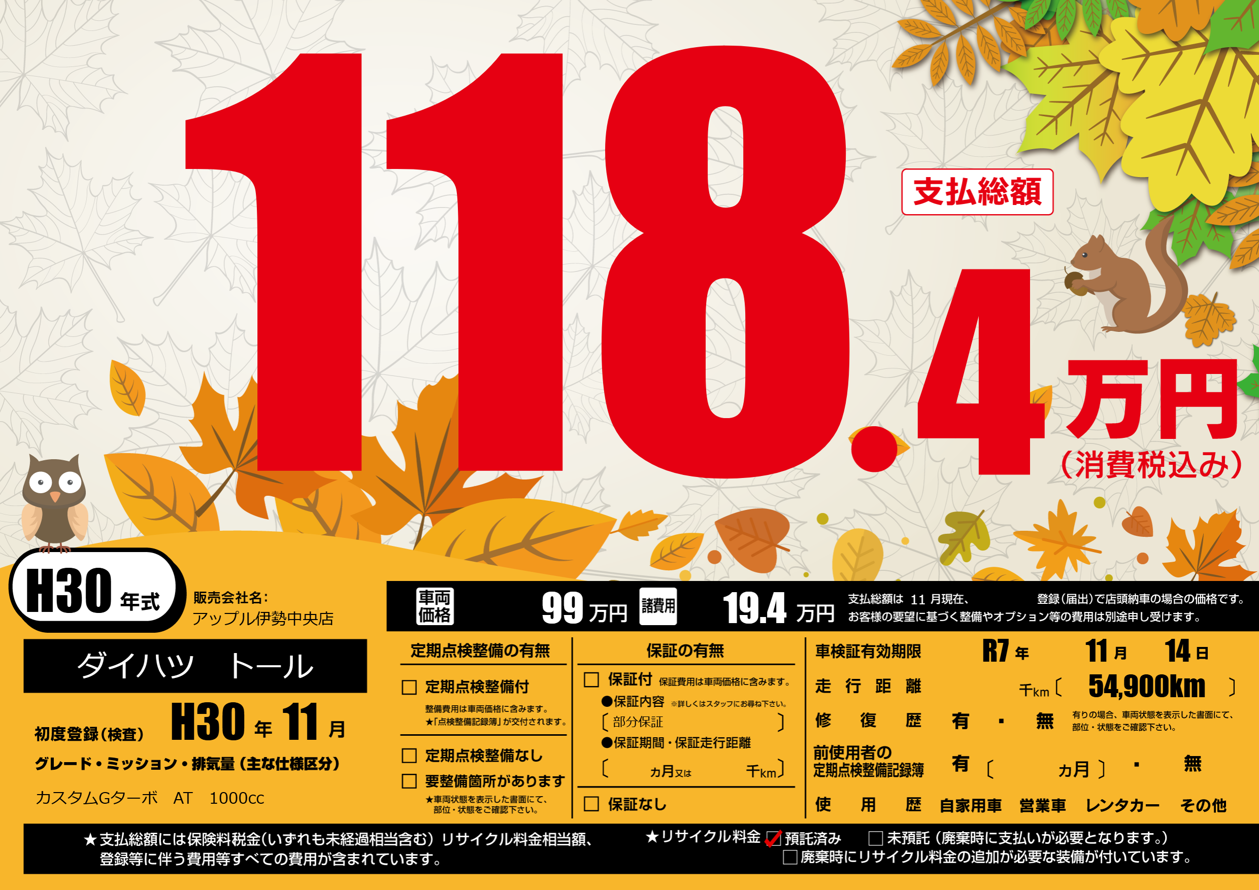 | 車名 | ダイハツ トール | グレード ミッション 排気量 |