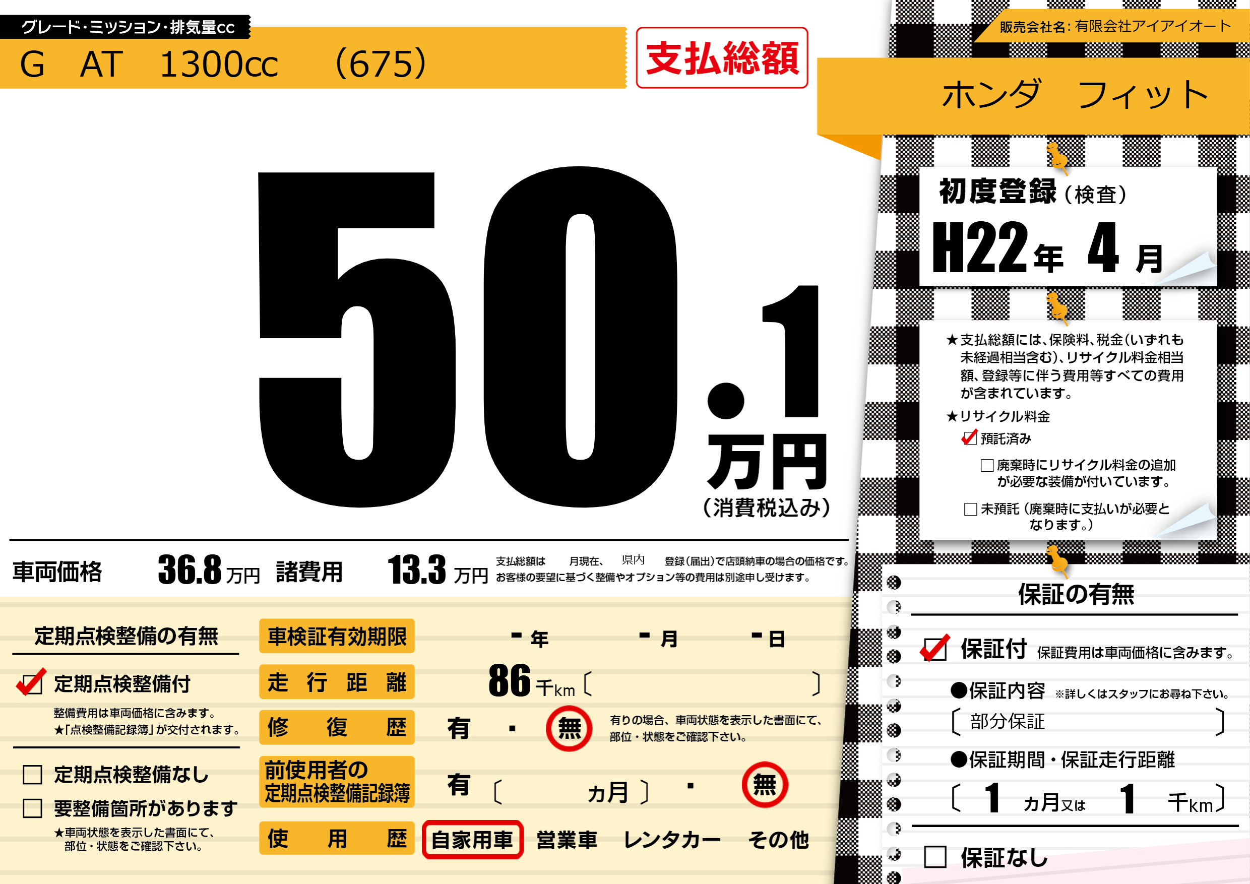 | 車名 | ホンダ フィット | グレード ミッション 排気量 |