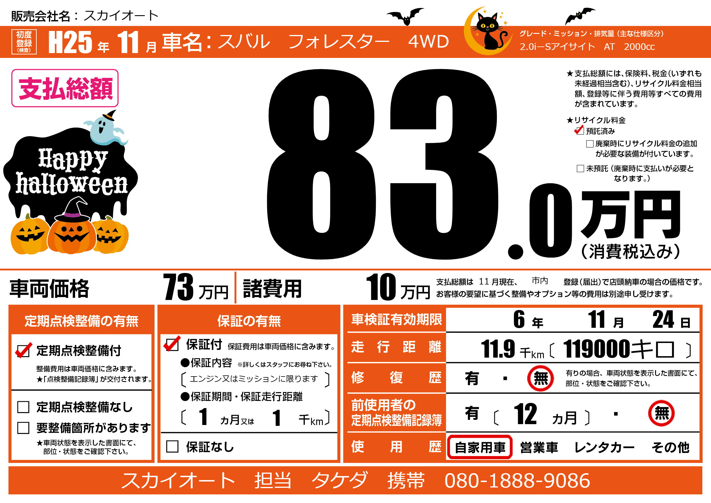 | 走行キロ | 1.1万km | 初年度登録 | H25年11月 |