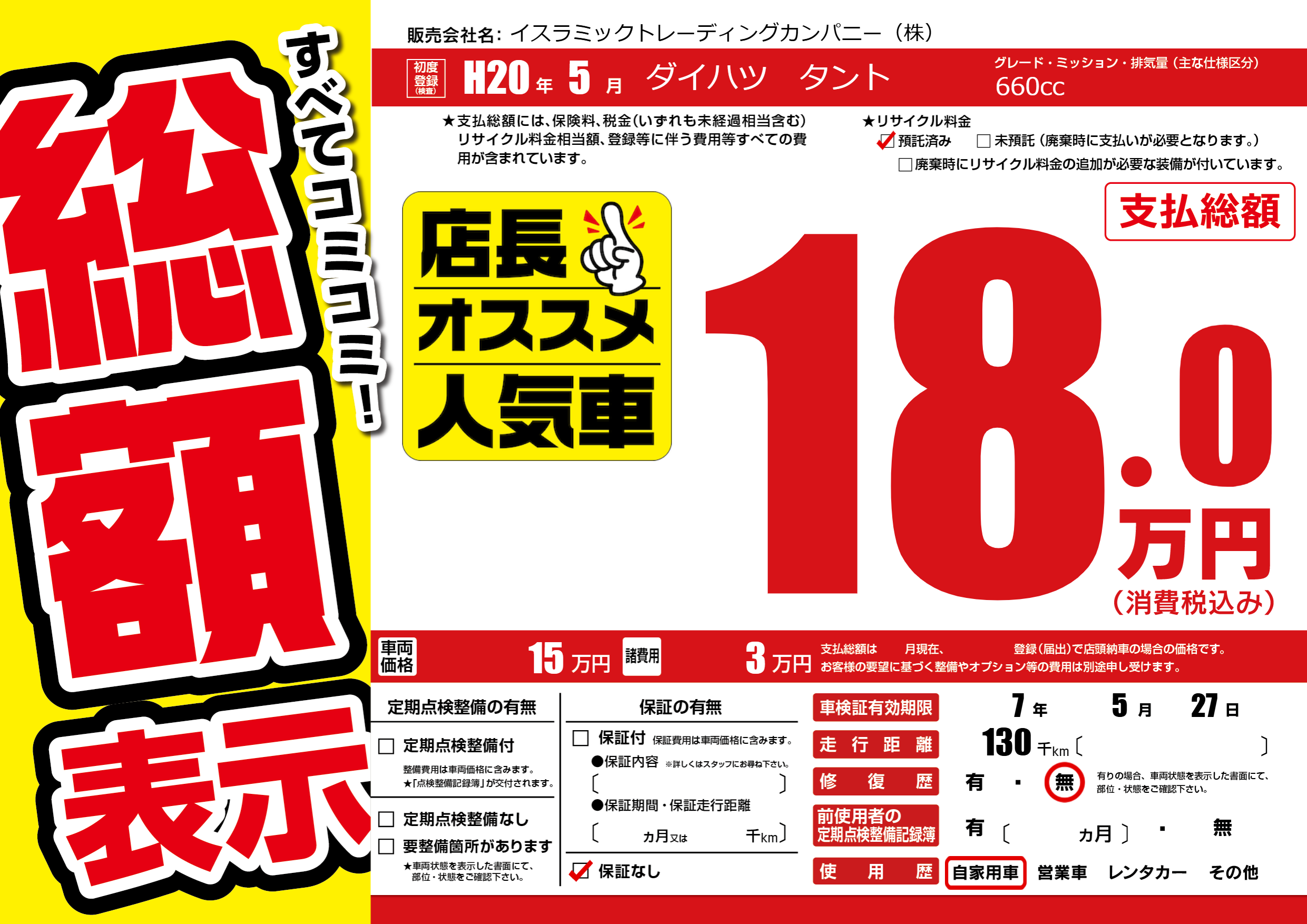 | 走行キロ | 13万km | 初年度登録 | H20年5月 |