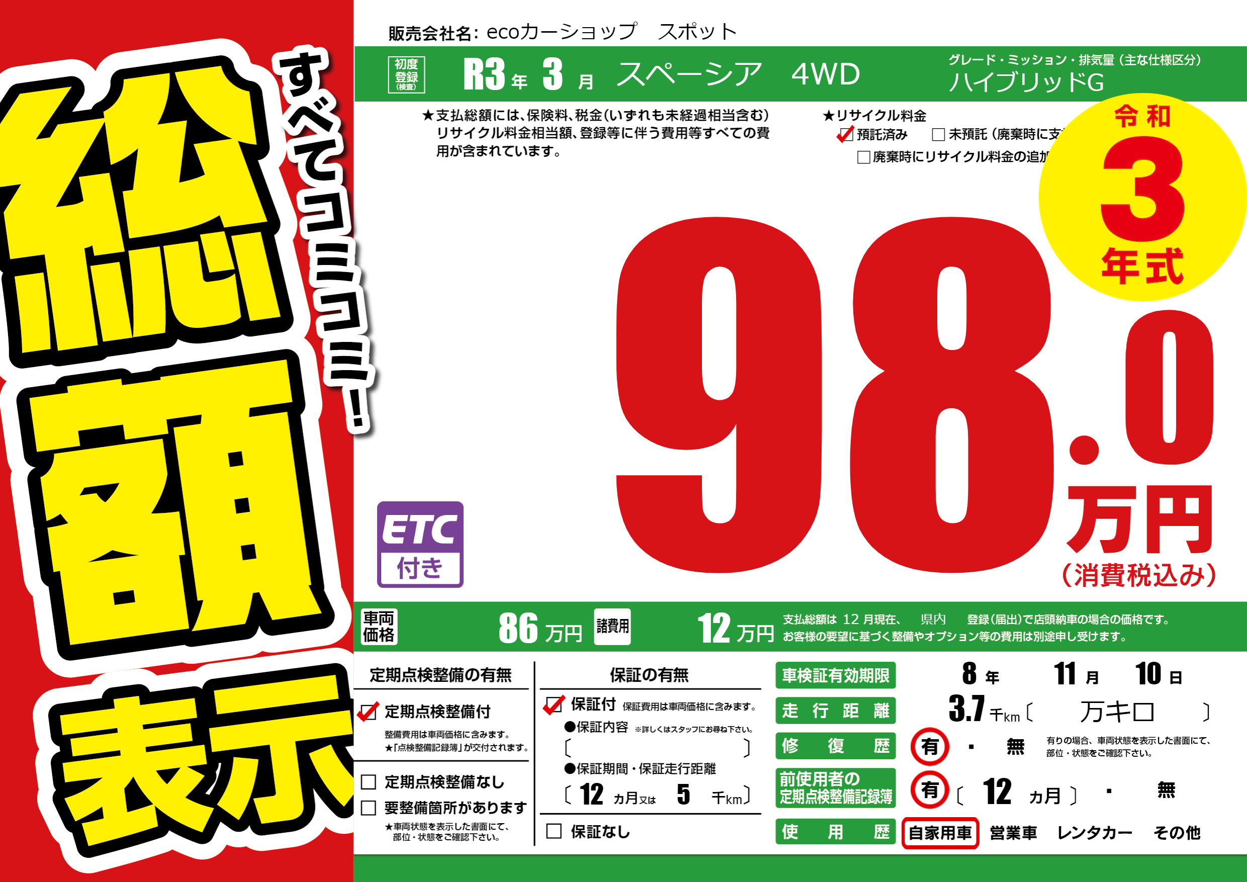 | 車名 | スペーシア 4WD | グレード ミッション 排気量 |