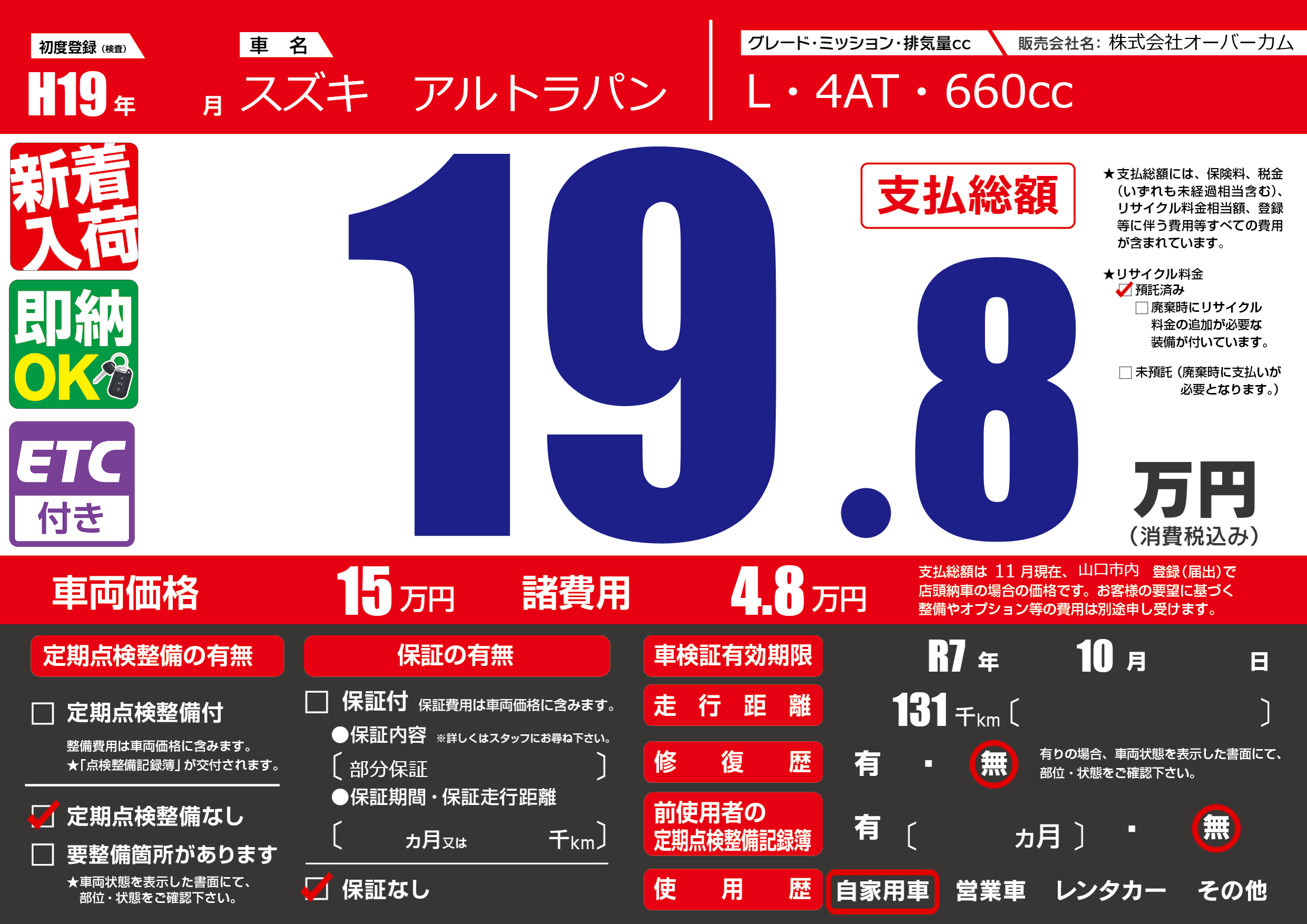 なし | 車検制限 | R7年10月---月 |
