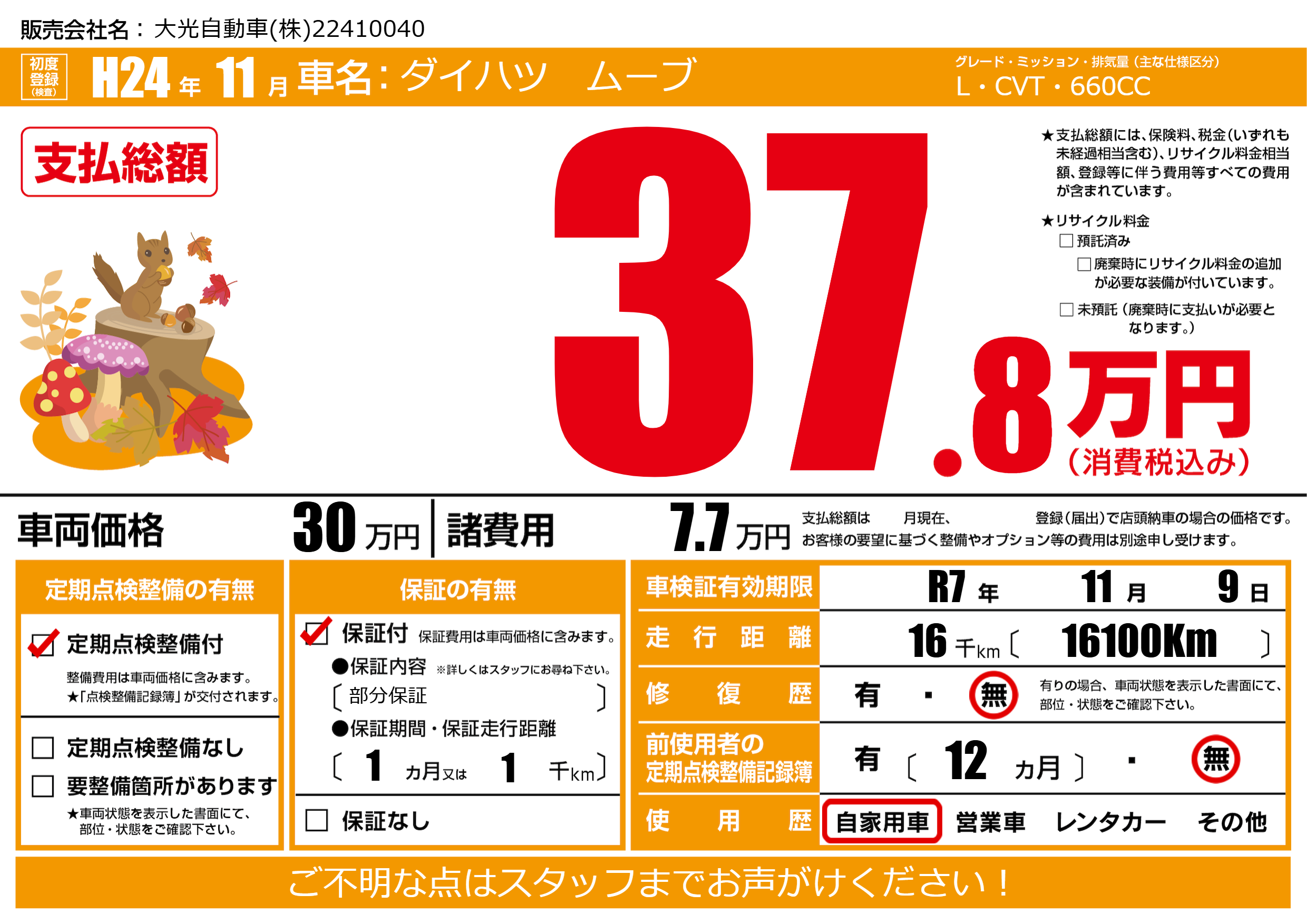 | 走行キロ | 1.6万km | 初年度登録 | H24年11月 |