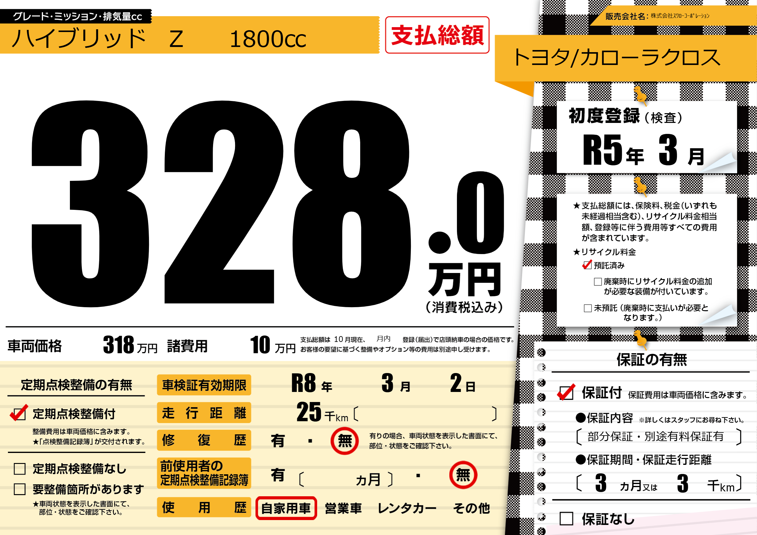 | 車名 | トヨタ/カローラクロス | グレード ミッション 排気量 |