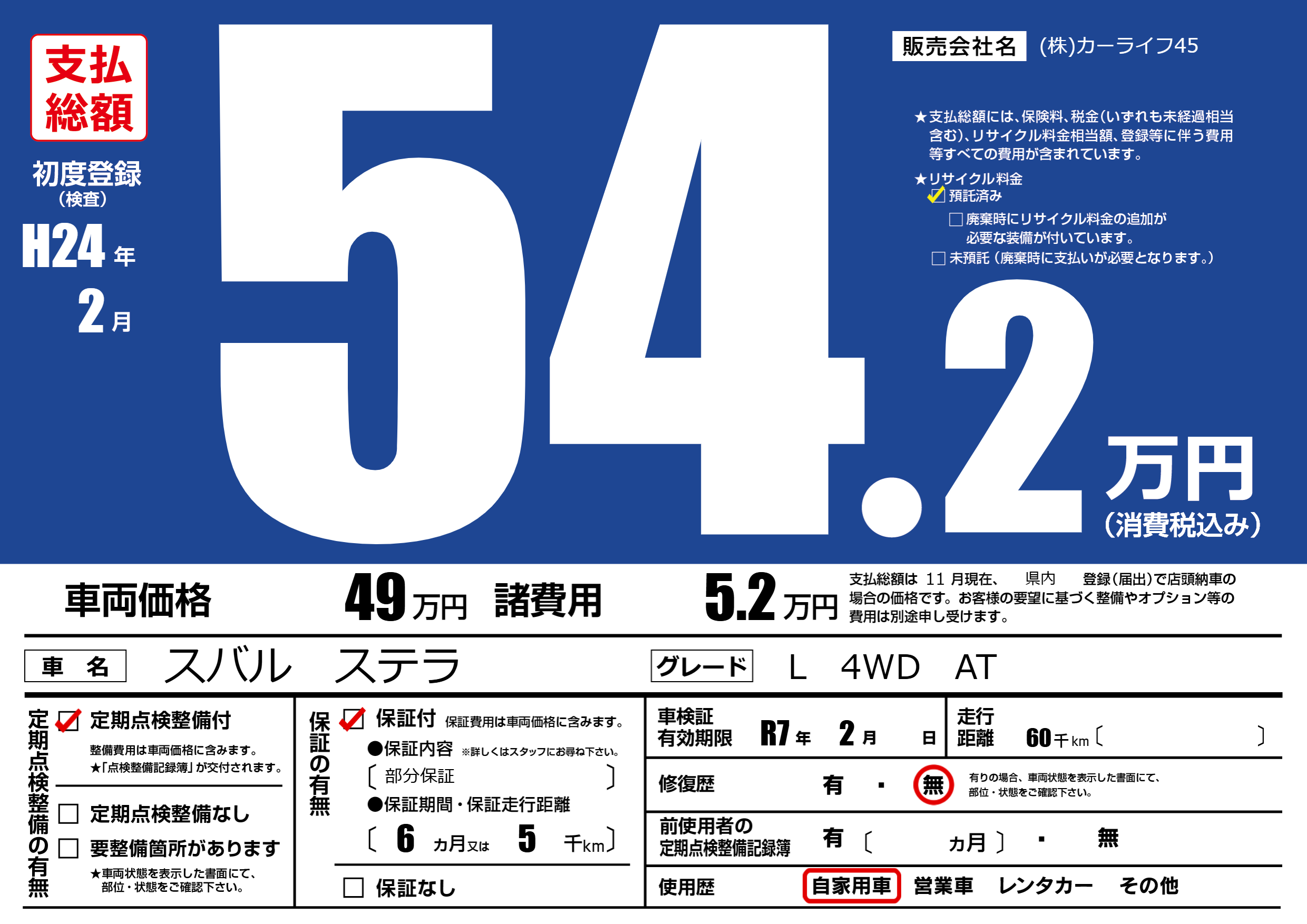 | 車名 | スバル ステラ | グレード ミッション 排気量 |