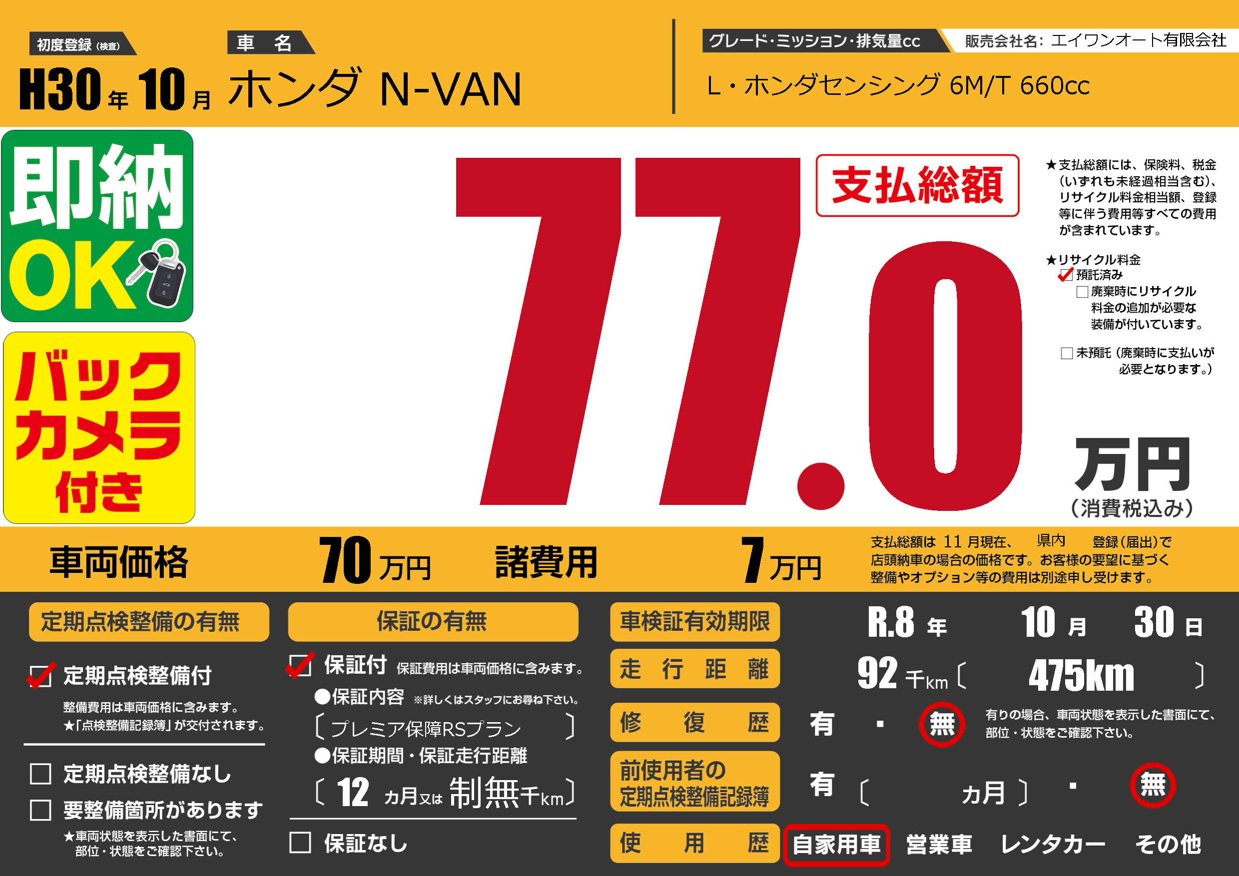 | 車名 | ホンダ N-VAN | グレード ミッション 排気量 |