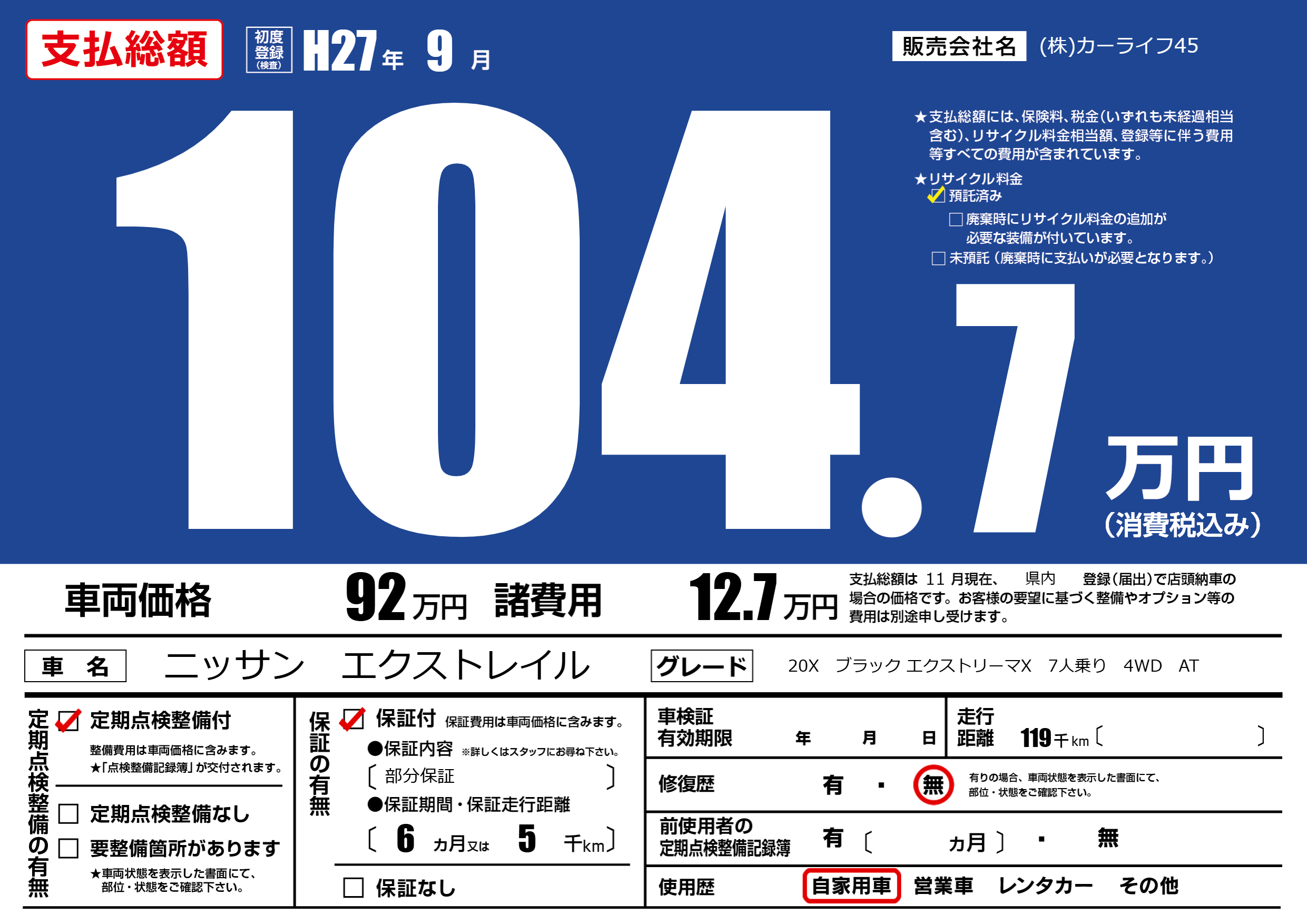 | 車名 | ニッサン エクストレイル | グレード ミッション 排気量 |