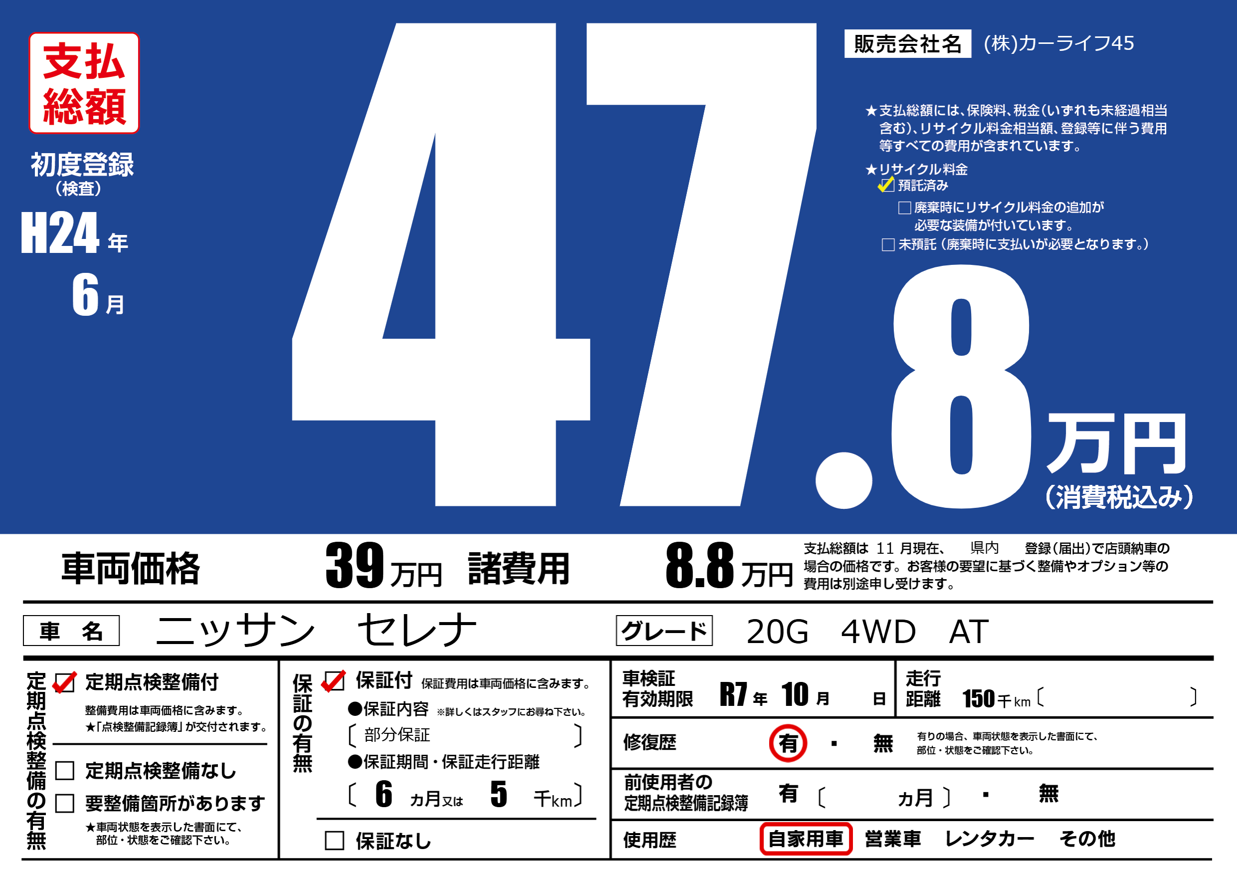 | 走行キロ | 15万km | 初年度登録 | H24年6月 |