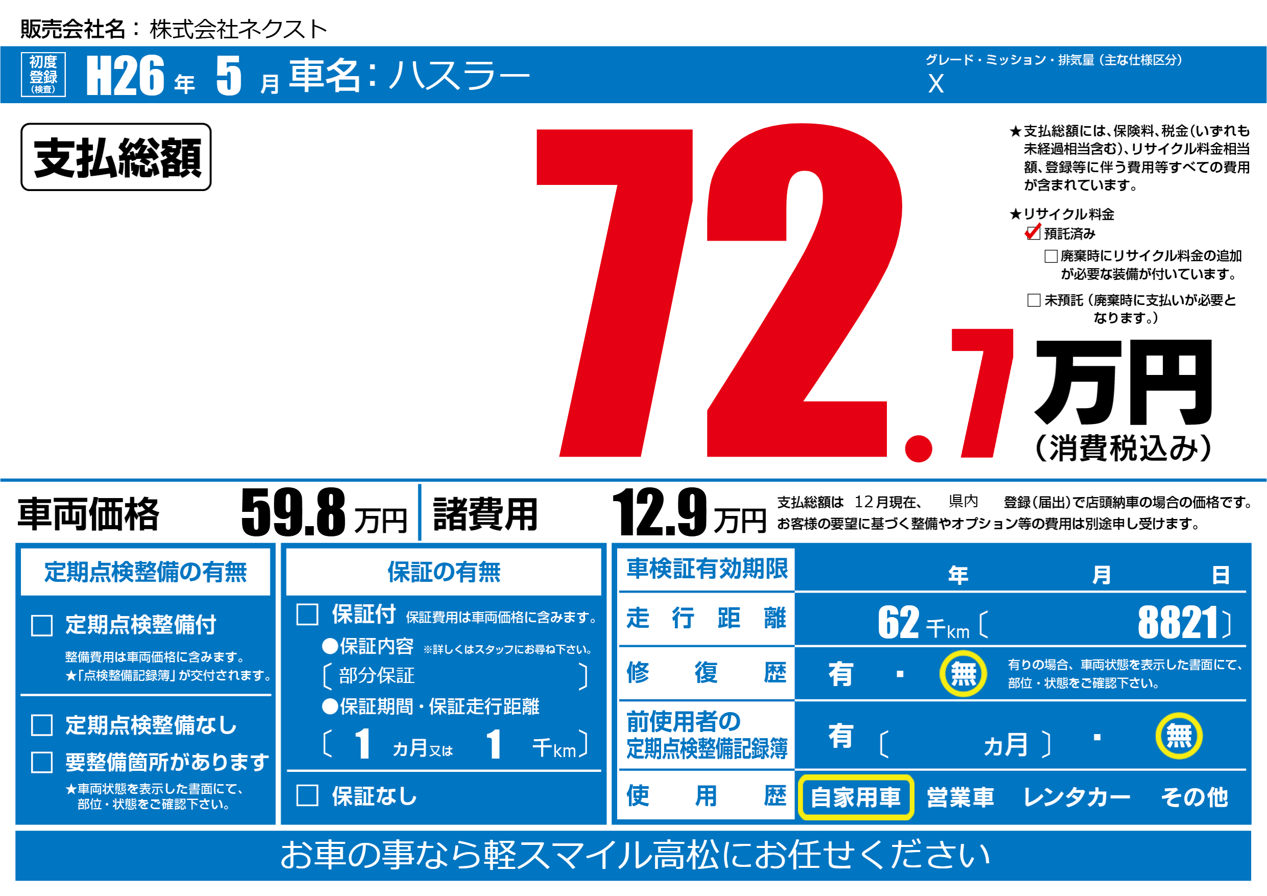 | 車名 | ハスラー | グレード ミッション 排気量 |
