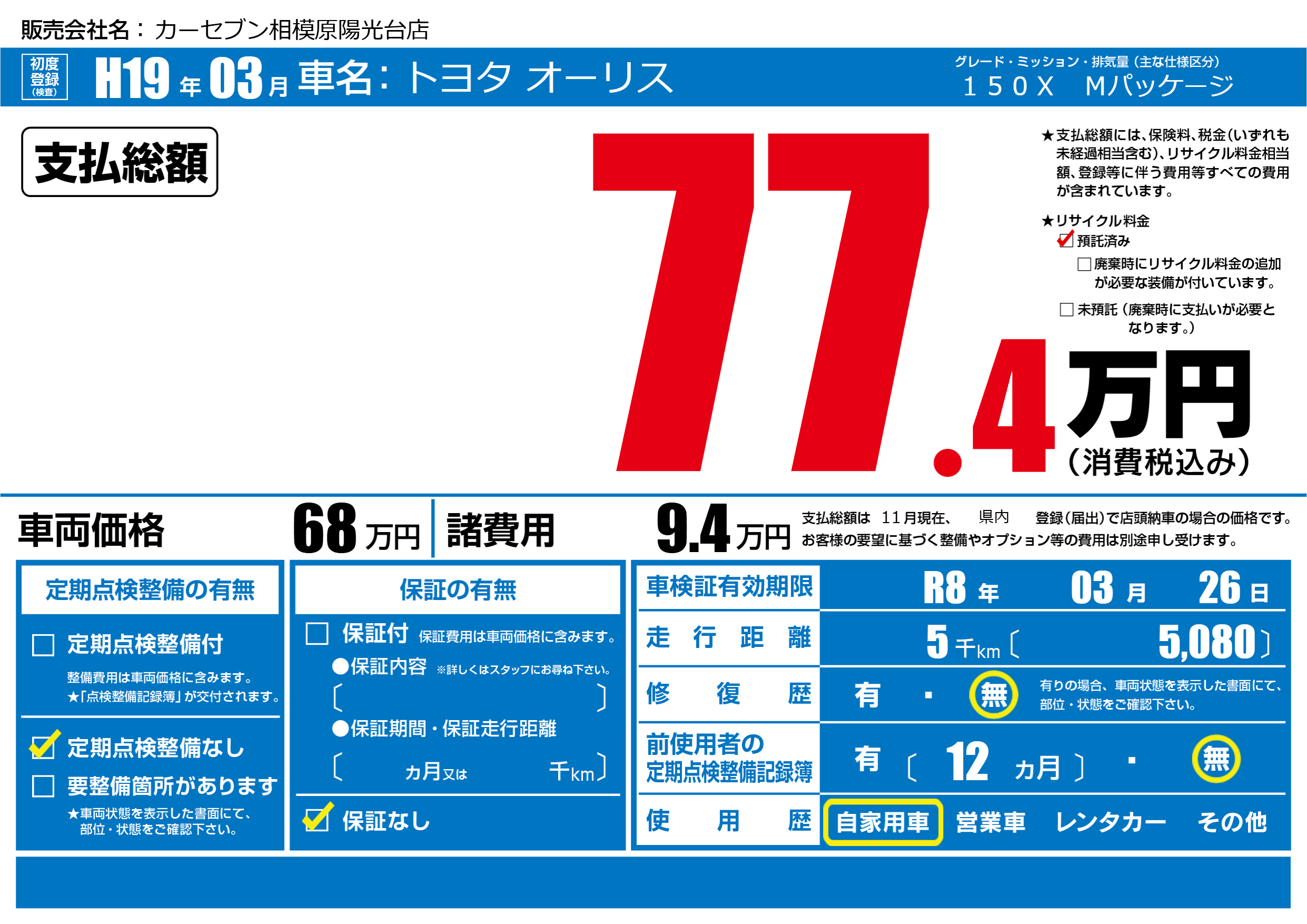 | 走行キロ | 0.5万km | 初年度登録 | H19年03月 |