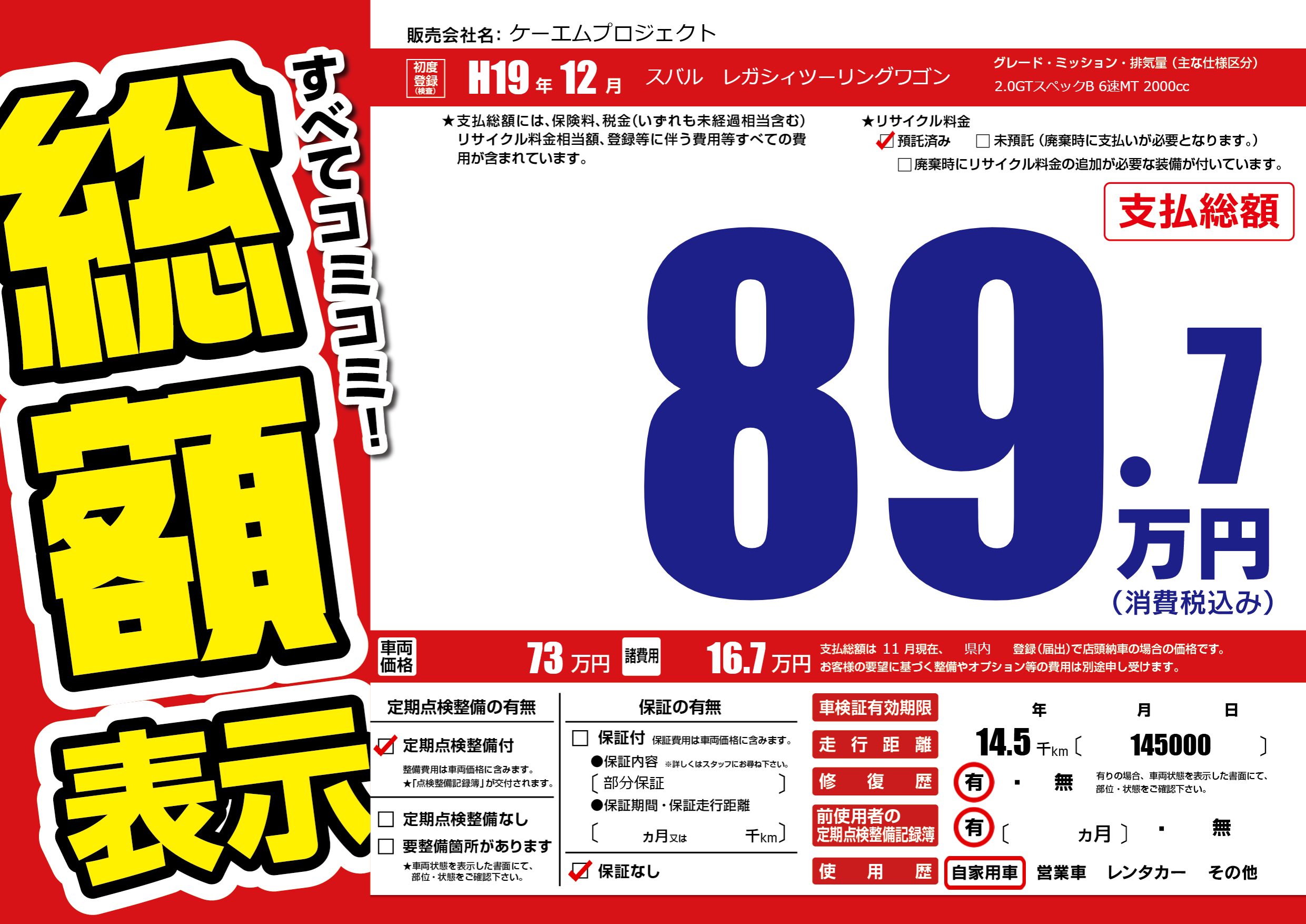 | 車名 | スバル レガシィツーリングワゴン | グレード ミッション 排気量 |