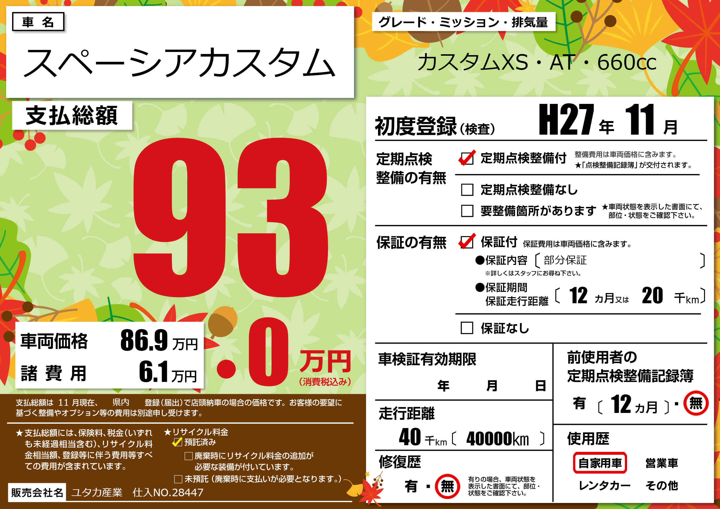 | 走行キロ | 4万km | 初年度登録 | H27年11月 |
