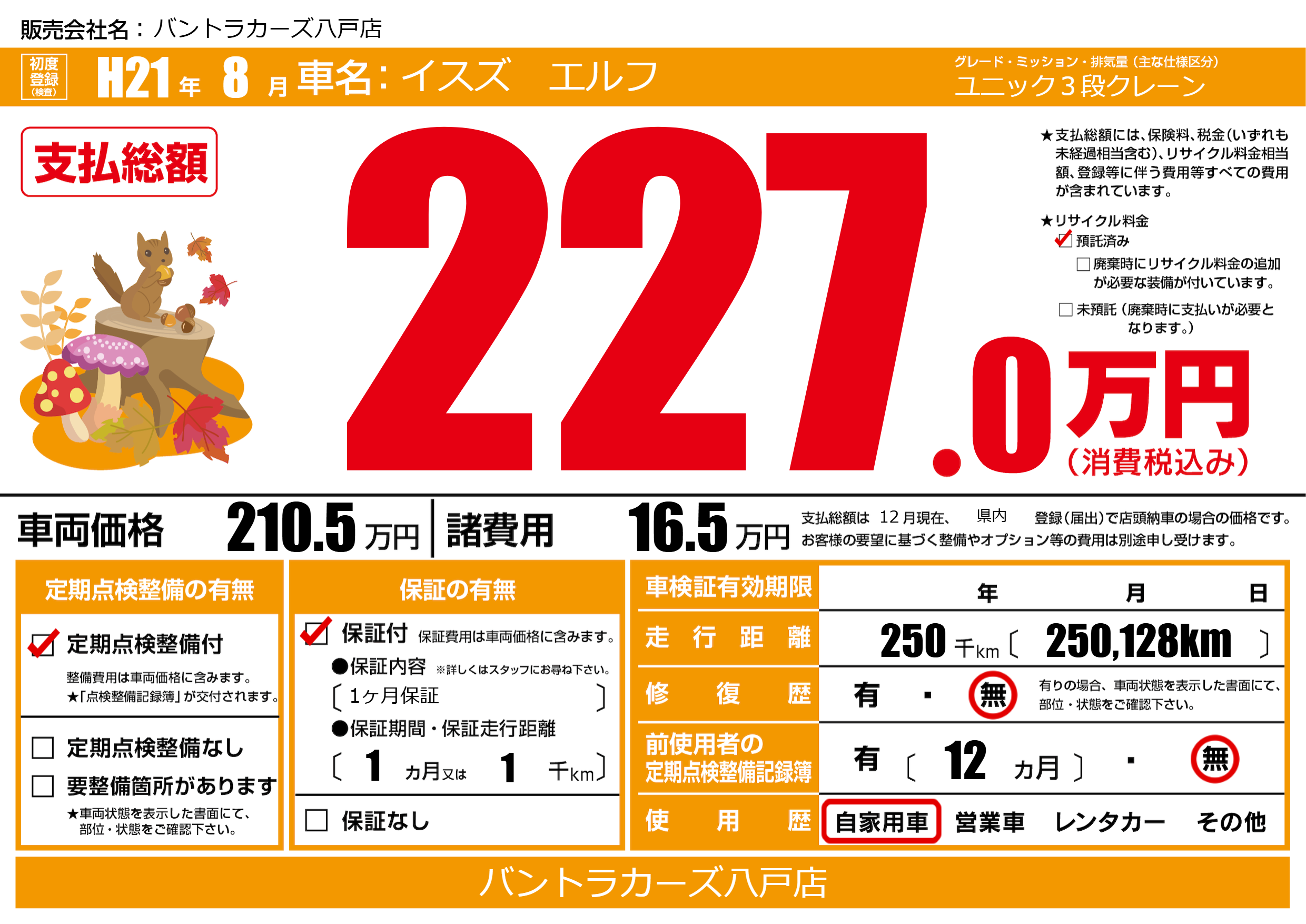| 走行キロ | 25万km | 初年度登録 | H21年8月 |