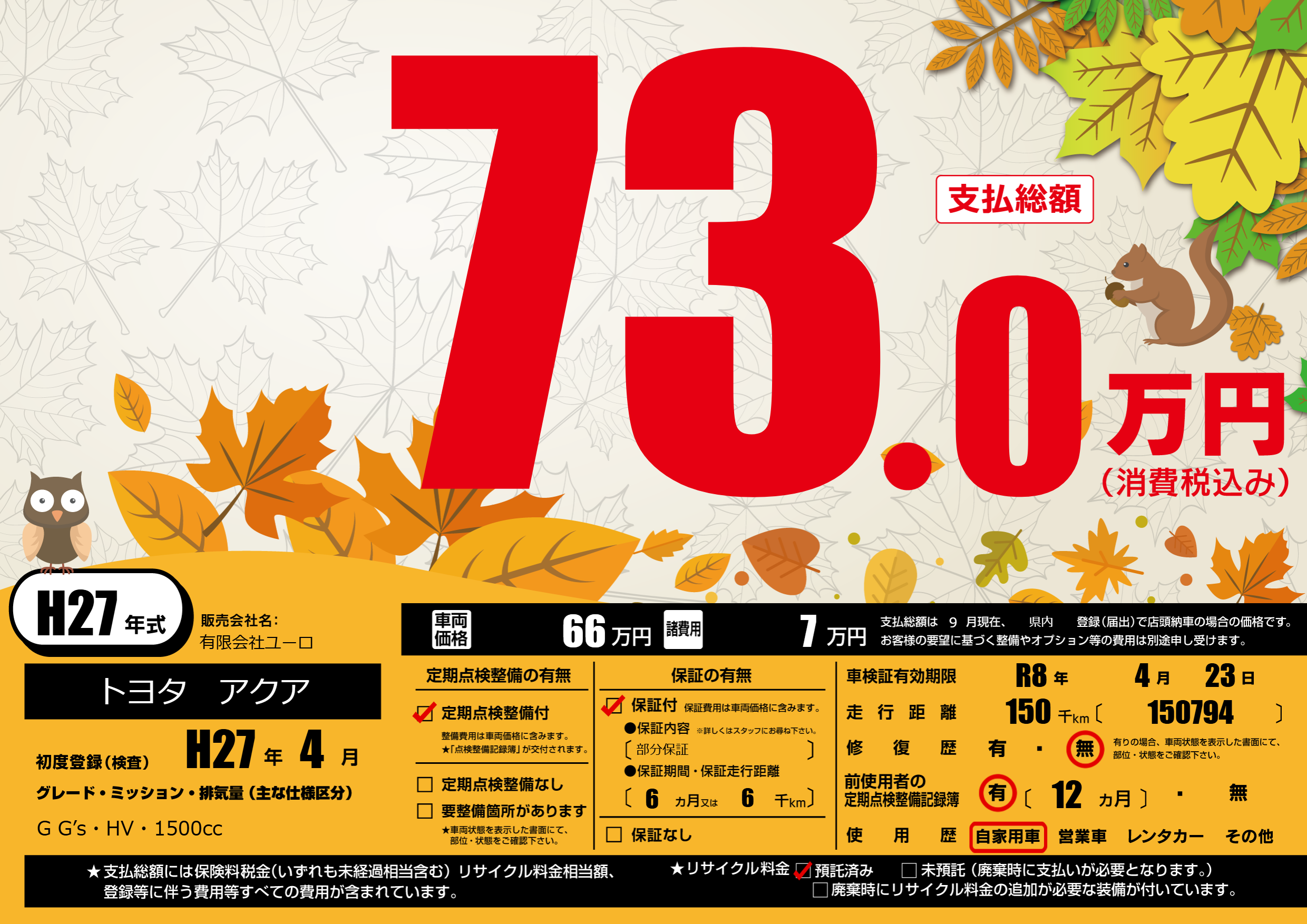 | 走行キロ | 15万km | 初年度登録 | H27年4月 |