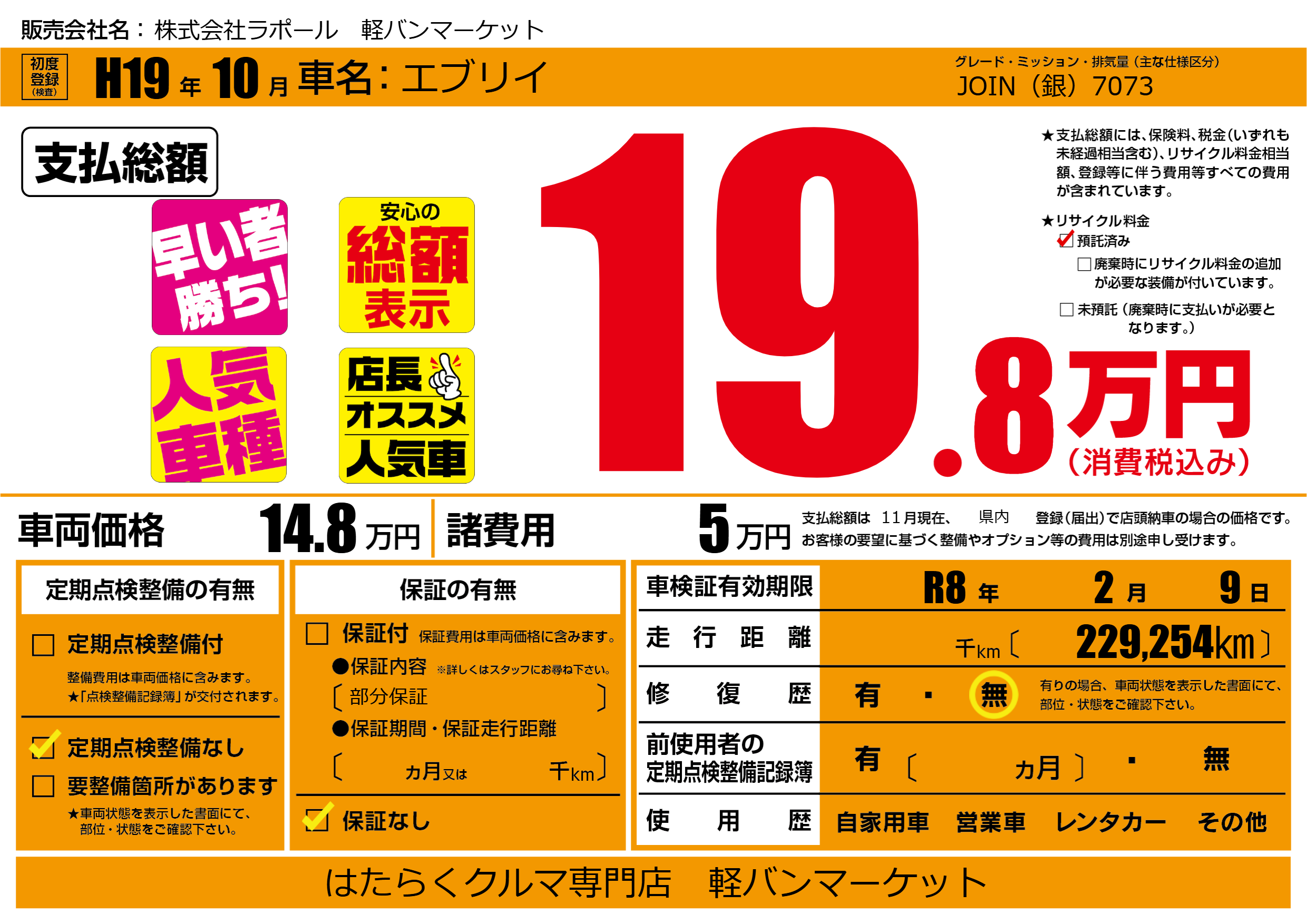 | 定期点検整備 | 定期点検整備なし | ||