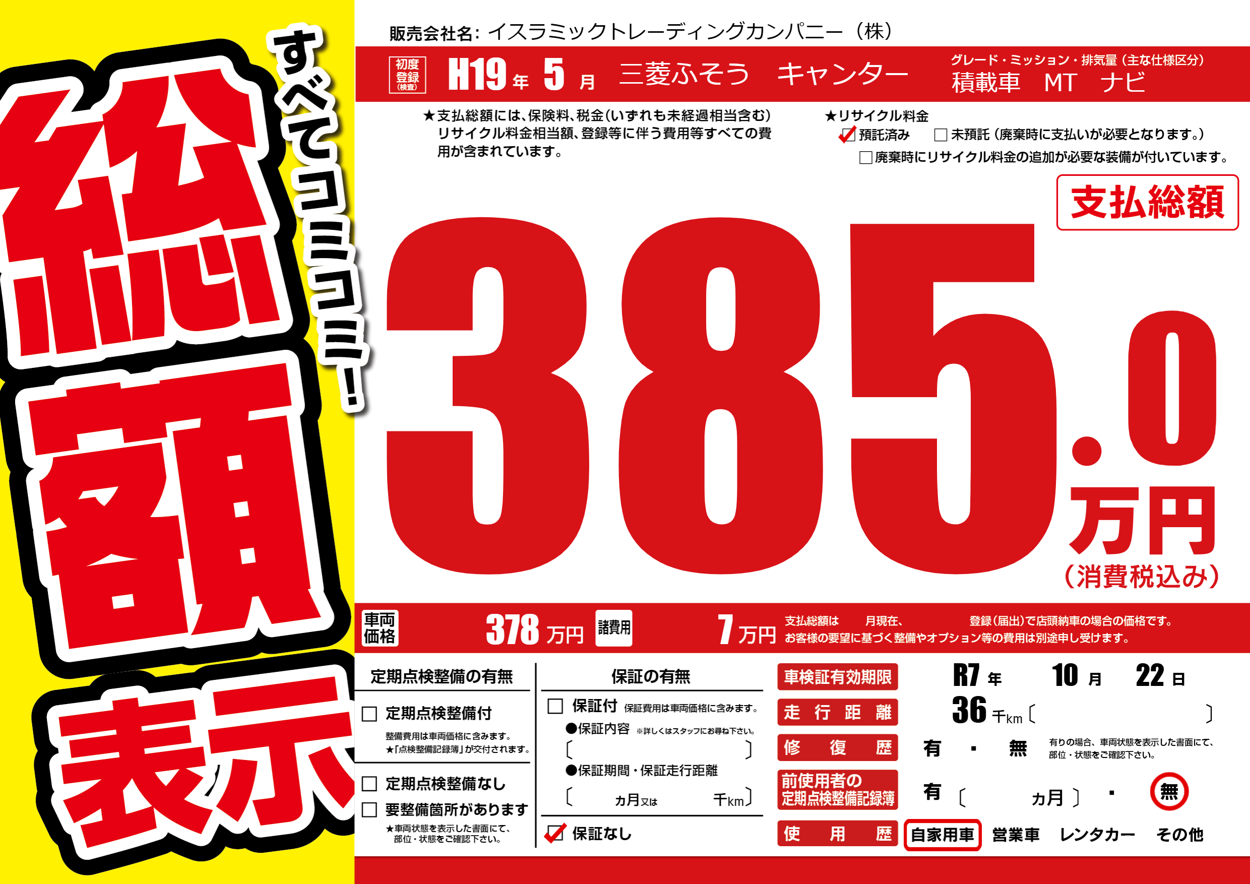 | 車名 | 三菱ふそう キャンター | グレード ミッション 排気量 |